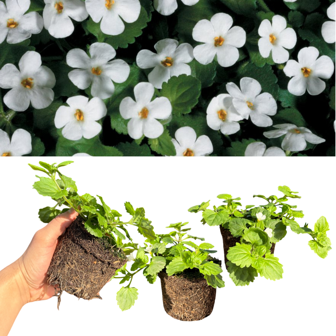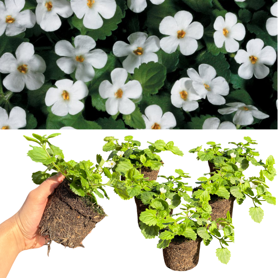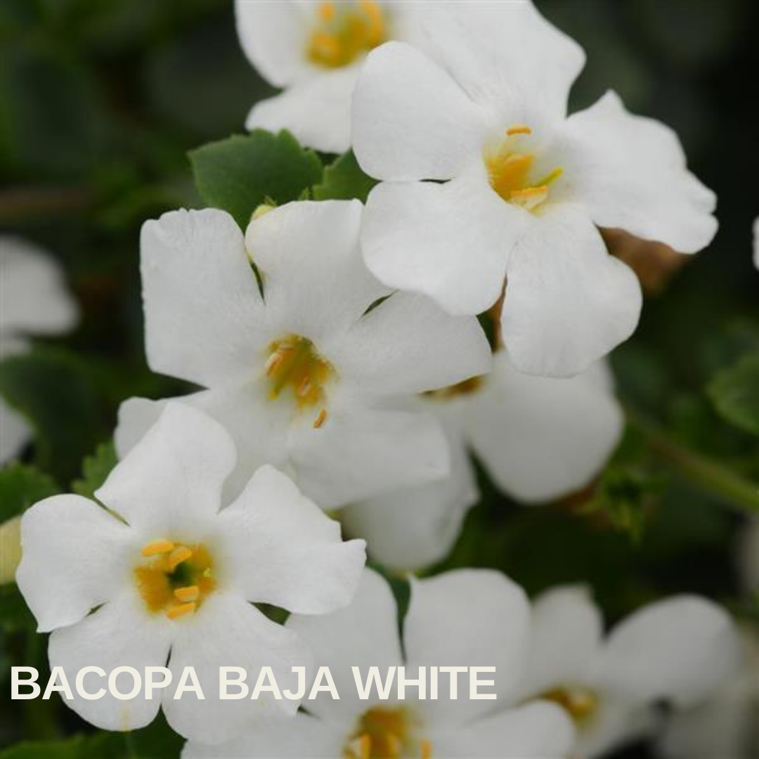 HUNDREDS OF BEAUTIFUL FLOWERS AND LUSH GREEN FOLIAGE – Part of the Bacopa Plants series (Sutera cordata), Baja White is a robust, floriferous cultivar, known for producing masses of small, pure white, star-shaped flowers with subtle yellow centres. Its mounded, naturally trailing habit creates a graceful waterfall of lush green leaves & showy blooms—perfect for mixed containers, hanging baskets & garden beds. A popular summer-flowering plant, it blooms nonstop from early spring to autumn.