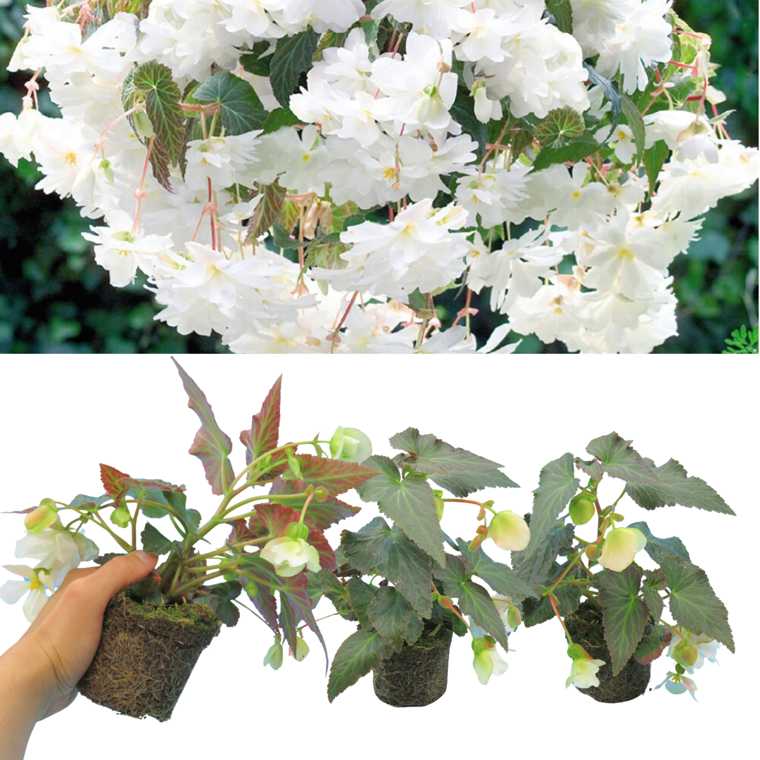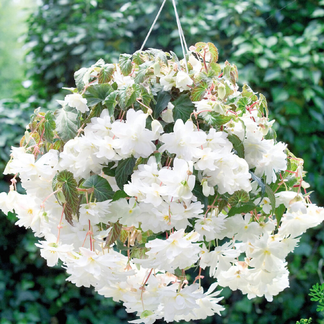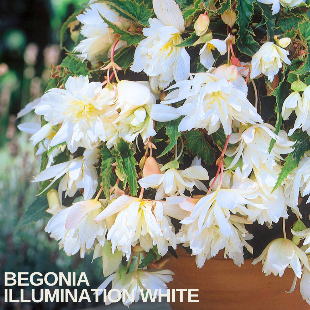 Begonia 'Illumination White' brings a pure, ethereal beauty to any shaded garden corner. It’s popular for its large, fully double blooms, with densely layered, ruffled petals in a creamy white hue—gently kissed with the faintest touch of soft yellow at the centre—& framed by lush, dark green foliage. With its trailing habit, it spills elegantly over the edges of hanging baskets, window boxes & containers, forming a vibrant, flowing canopy of colour all summer long.
