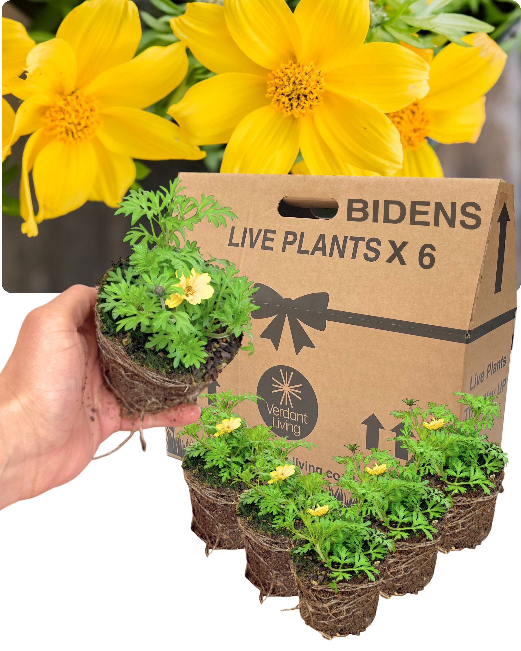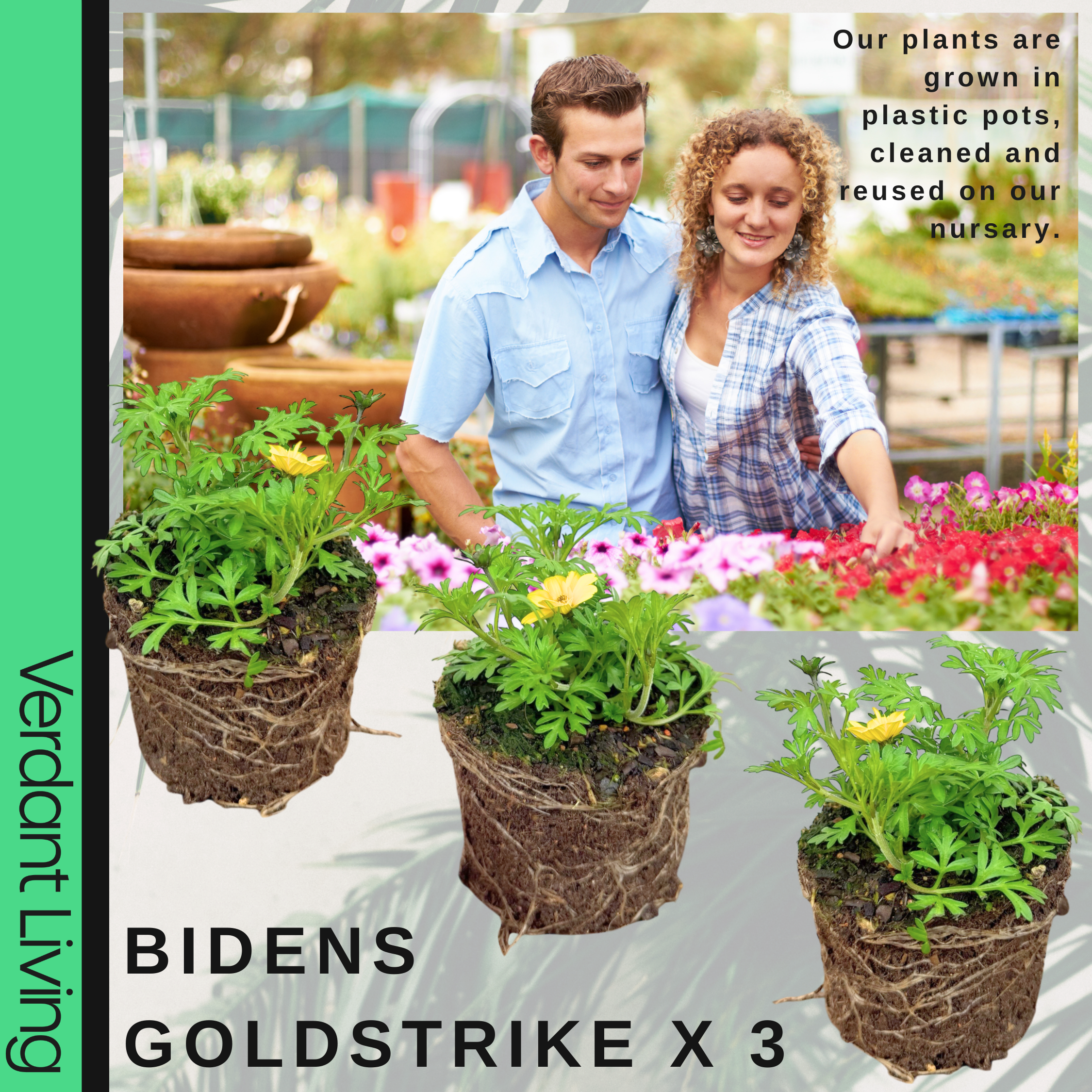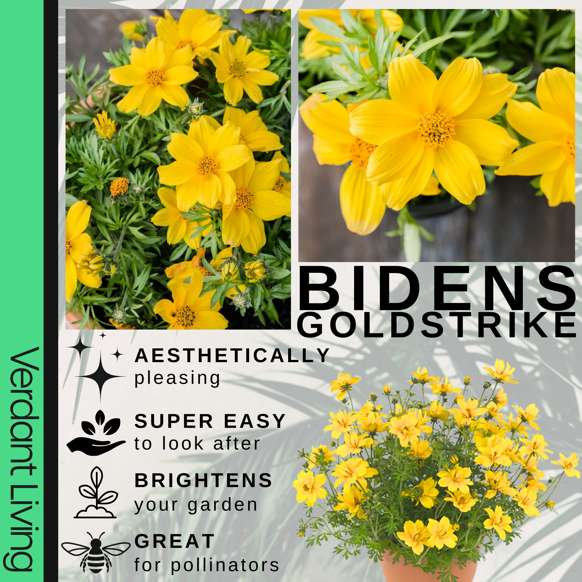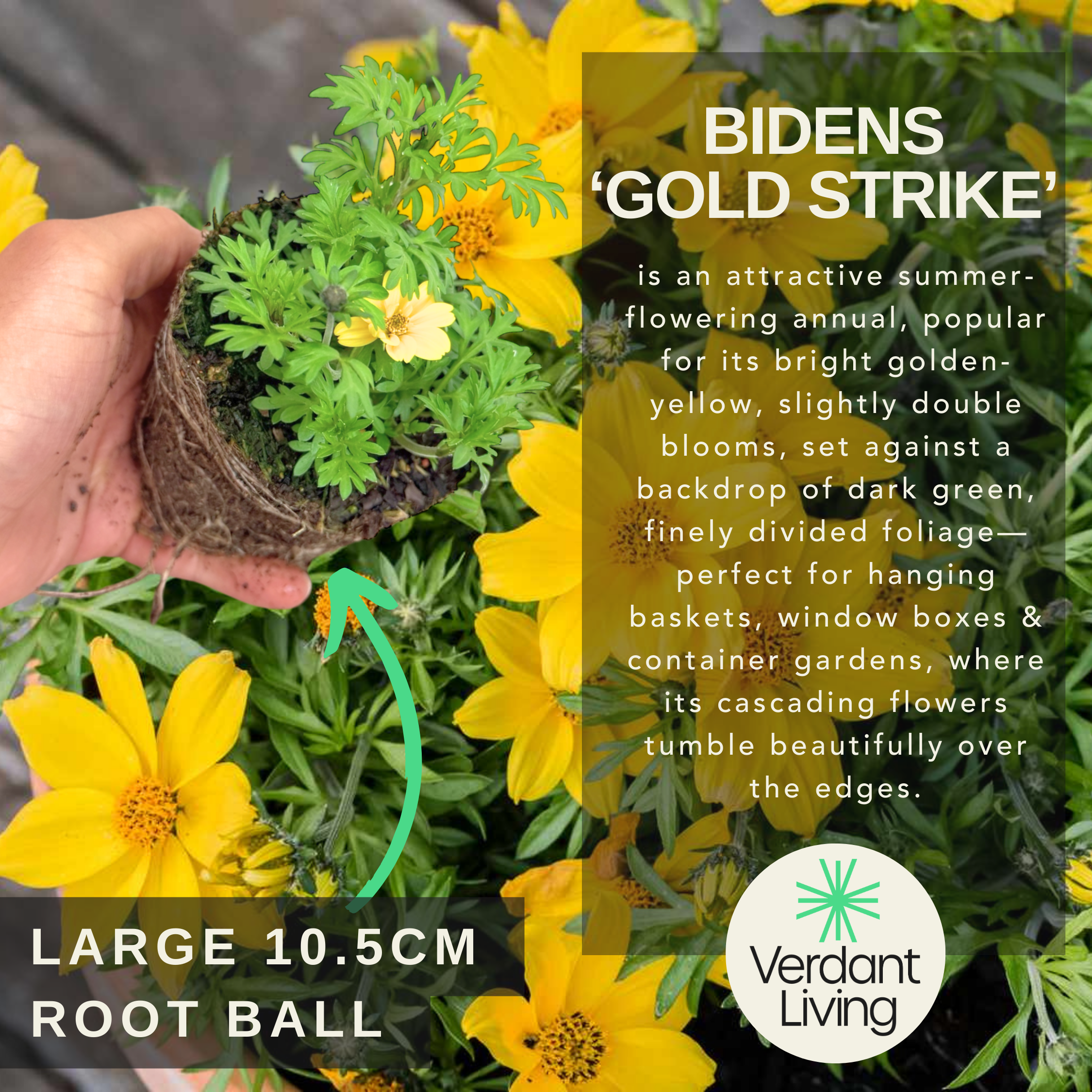 Bidens ‘Gold Strike’ is an attractive summer-flowering annual, popular for its bright golden-yellow, slightly double blooms, set against a backdrop of dark green, finely divided foliage—perfect for hanging baskets, window boxes & container gardens, where its cascading flowers tumble beautifully over the edges. These beautiful bedding plants create a cheerful visual display that continues to glow from the height of summer into the crisp days of autumn.