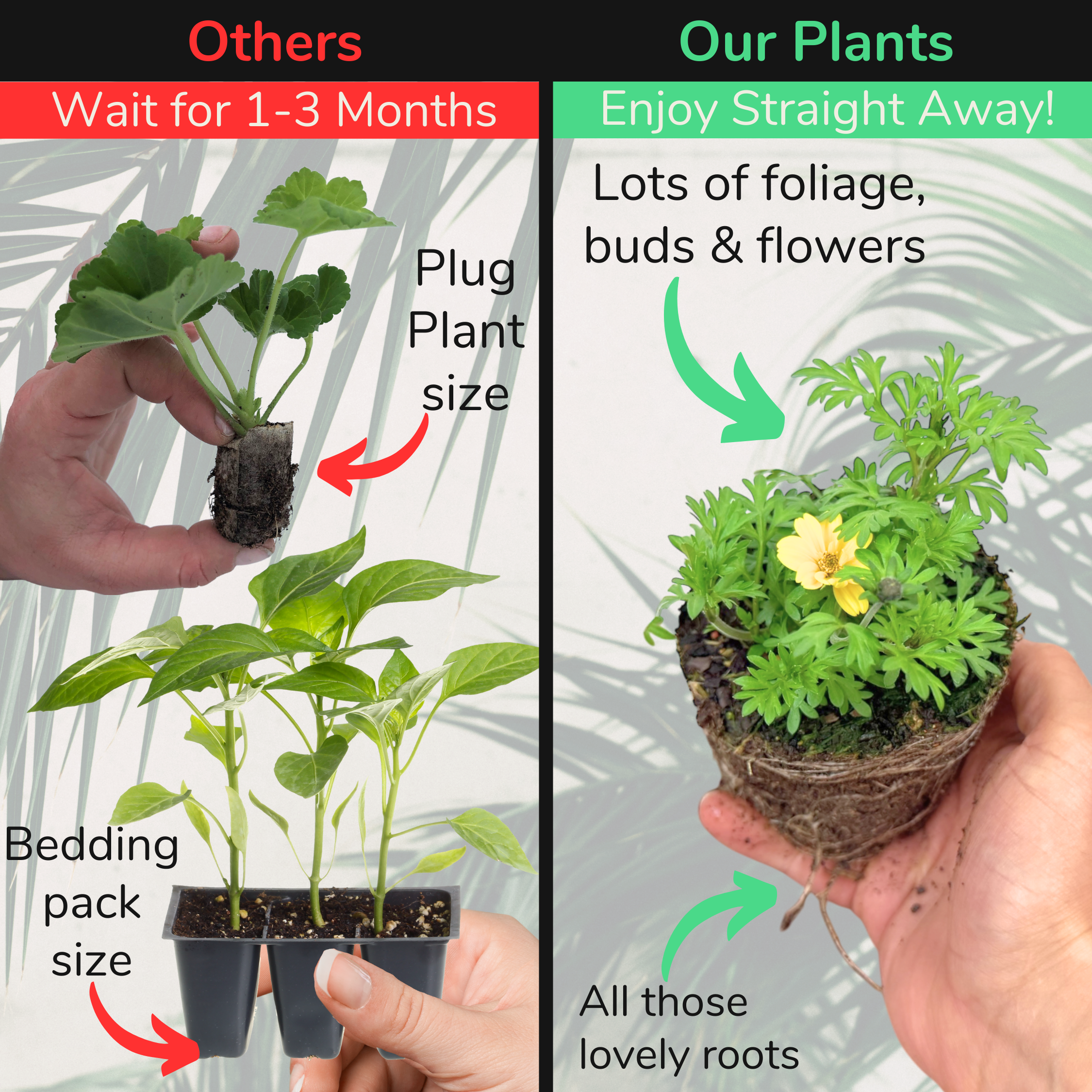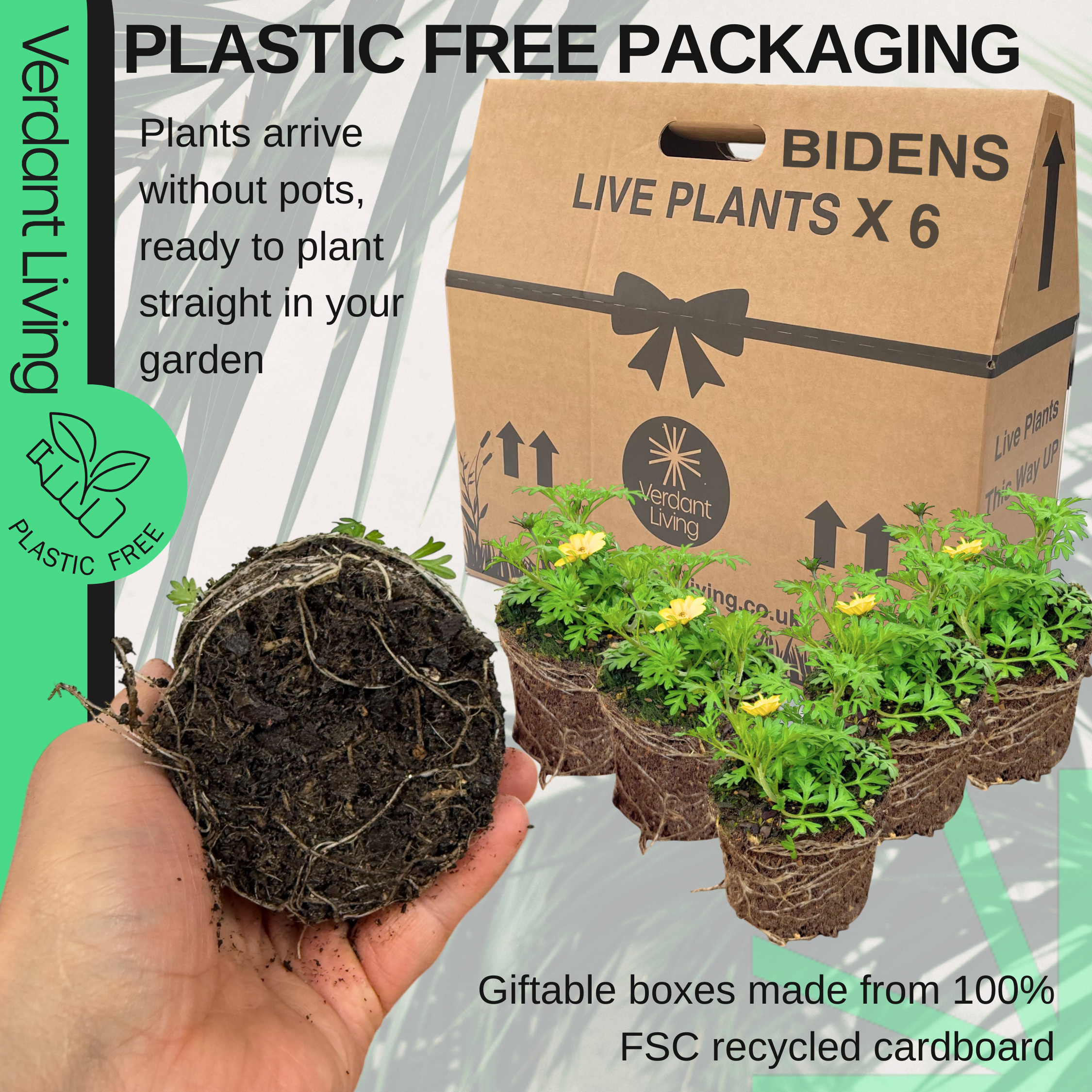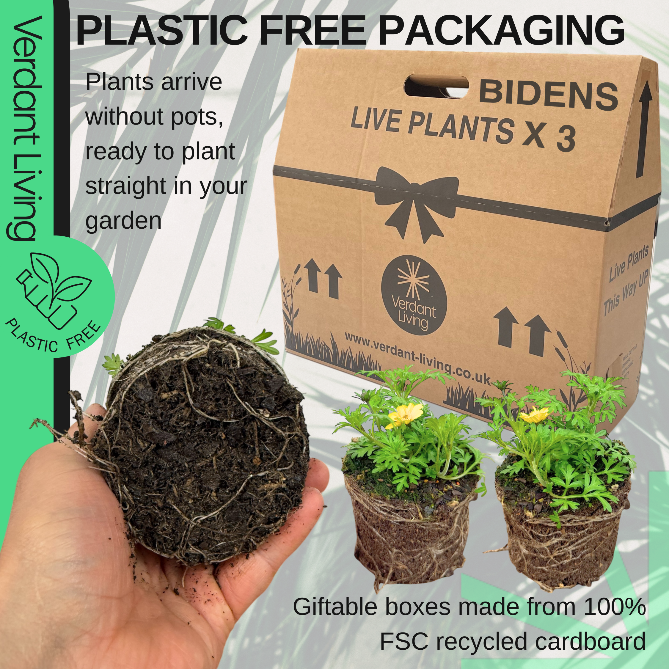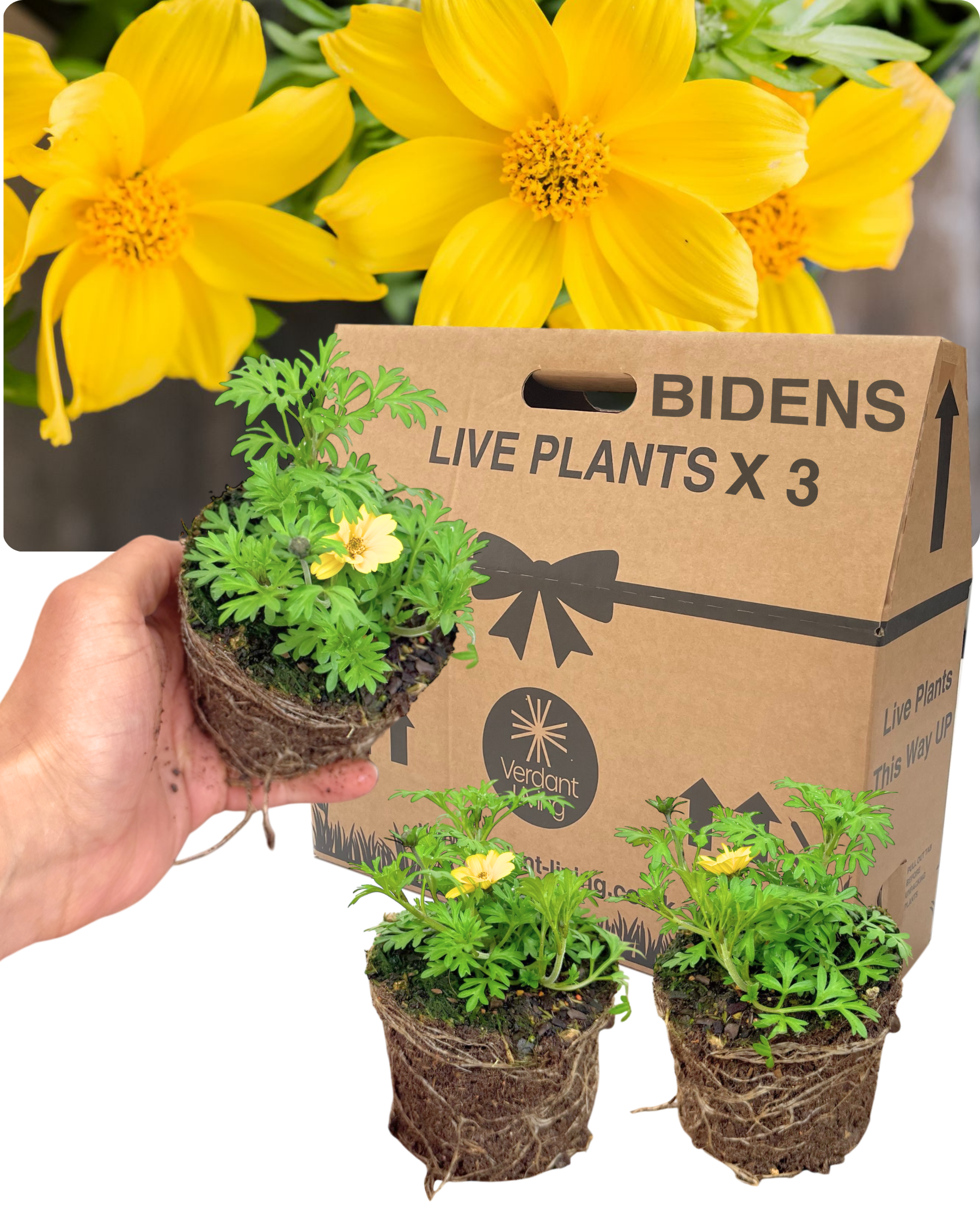 Bidens ‘Gold Strike’ is an attractive summer-flowering annual, popular for its bright golden-yellow, slightly double blooms, set against a backdrop of dark green, finely divided foliage—perfect for hanging baskets, window boxes & container gardens, where its cascading flowers tumble beautifully over the edges. These beautiful bedding plants create a cheerful visual display that continues to glow from the height of summer into the crisp days of autumn.