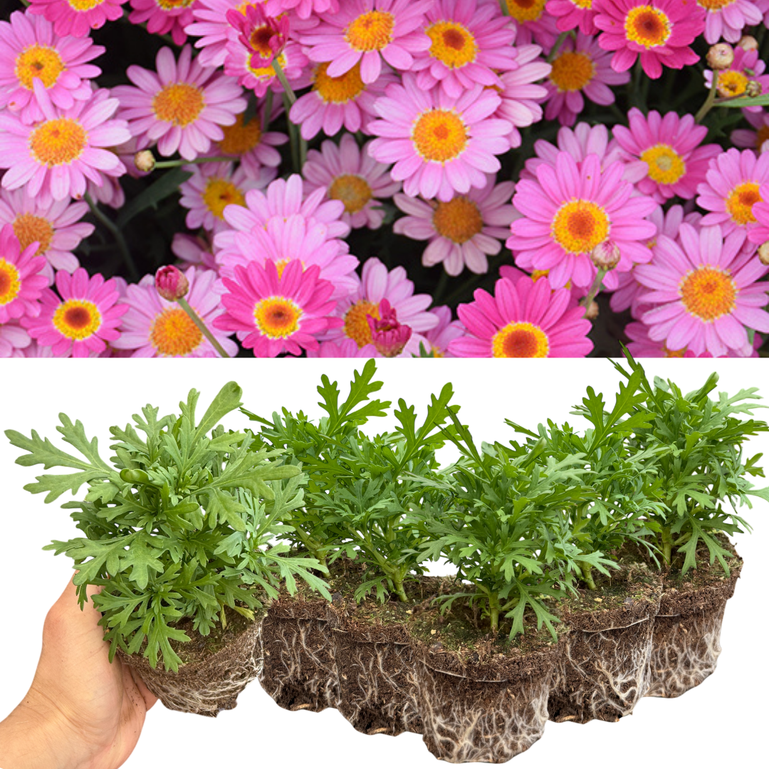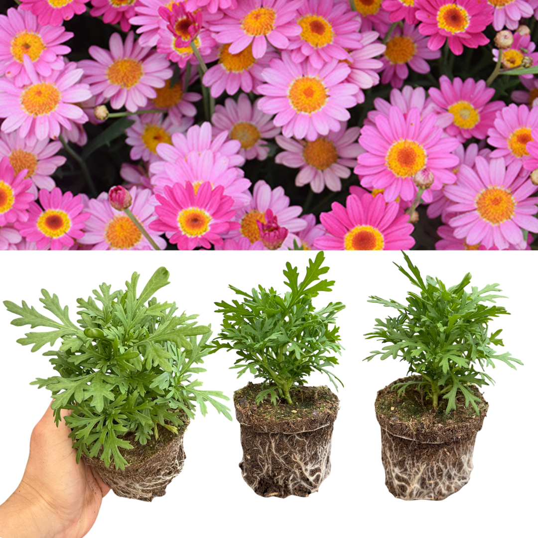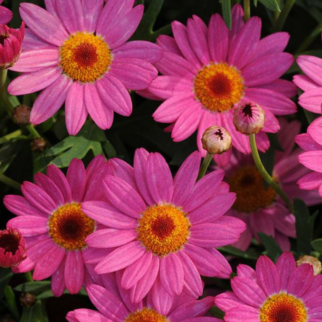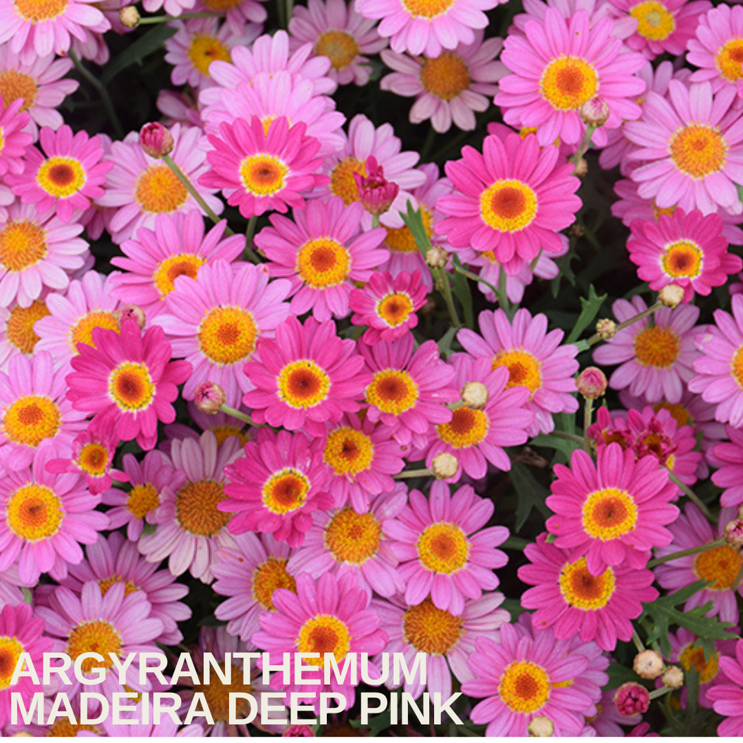 Argyranthemum Madeira Deep Pink (Marguerite Daisy) is a vibrant, highly floriferous plant, popular for its classic daisy-like flowers. The blooms are arranged in multiple layers & distinguished by deep rose-pink petals & a golden-yellow centre, set against lush, dark green foliage. Loved by pollinators like bees & butterflies, these well-branched, upright plants grow up to 30cm tall—perfect for containers & colourful bedding displays.