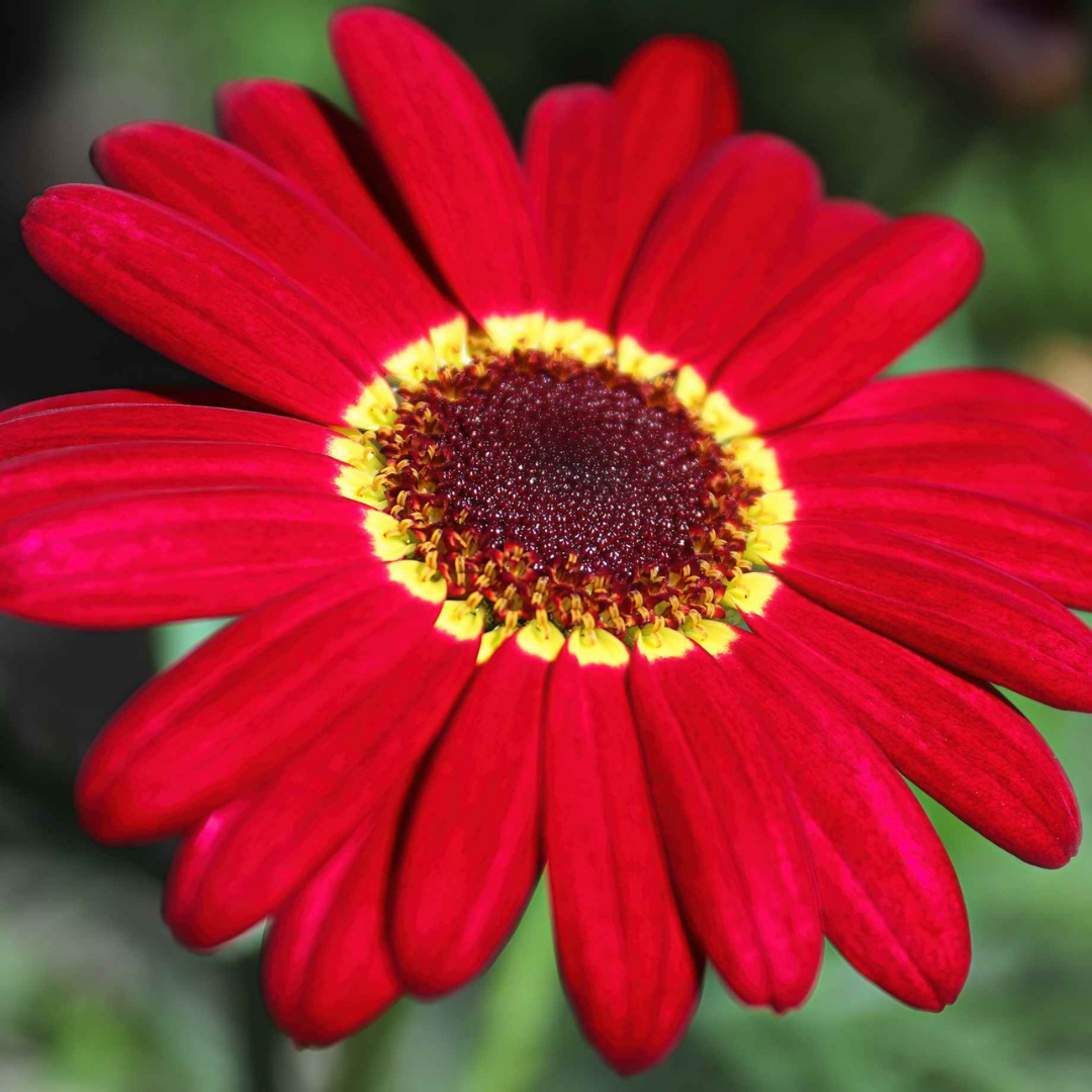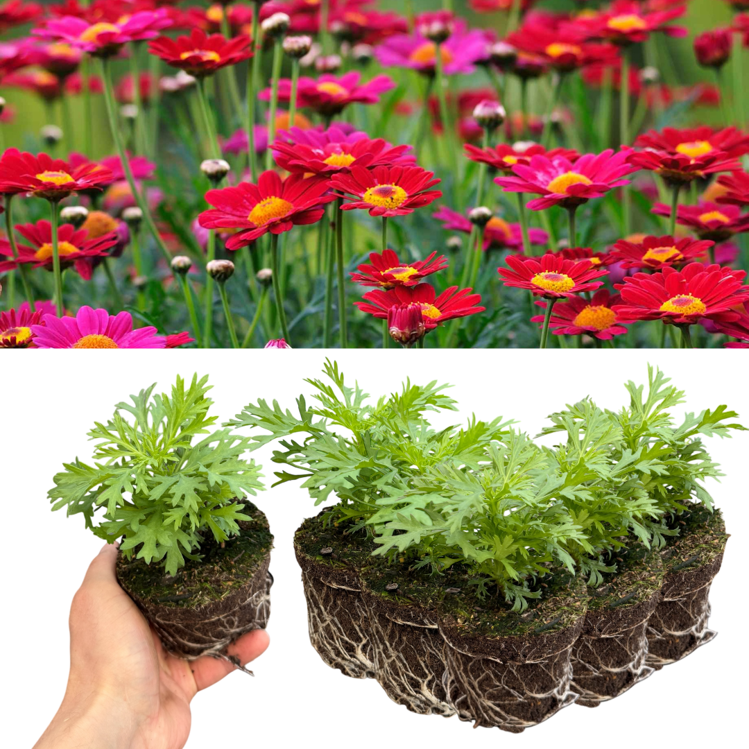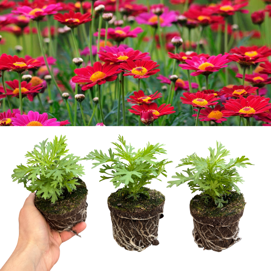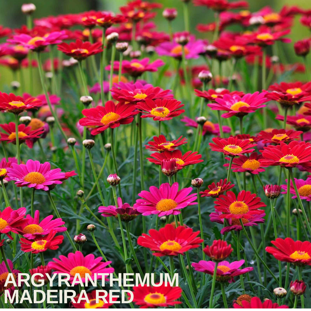 Argyranthemum Madeira Red (Marguerite Daisy) is a vibrant, highly floriferous plant, popular for its classic daisy-like flowers. The blooms are arranged in multiple layers & distinguished by rich cherry red petals & a golden-yellow centre, set against lush, dark green foliage. Loved by pollinators like bees & butterflies, these well-branched, upright plants grow up to 30cm tall—perfect for containers & colourful bedding displays.