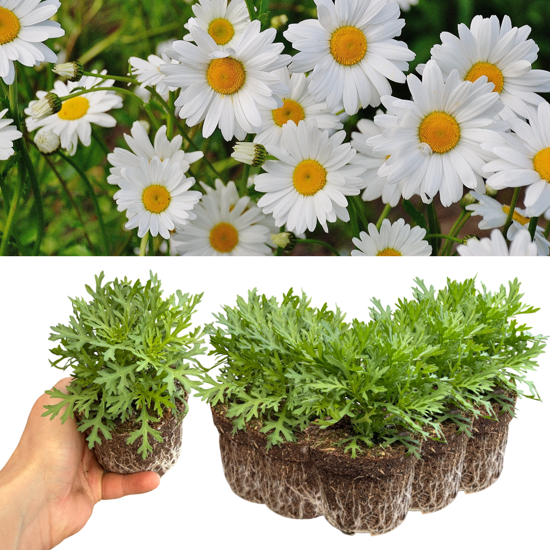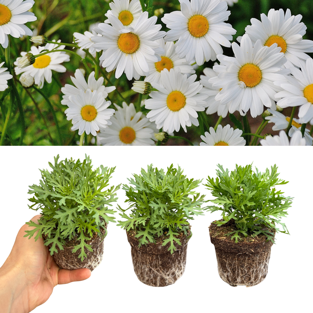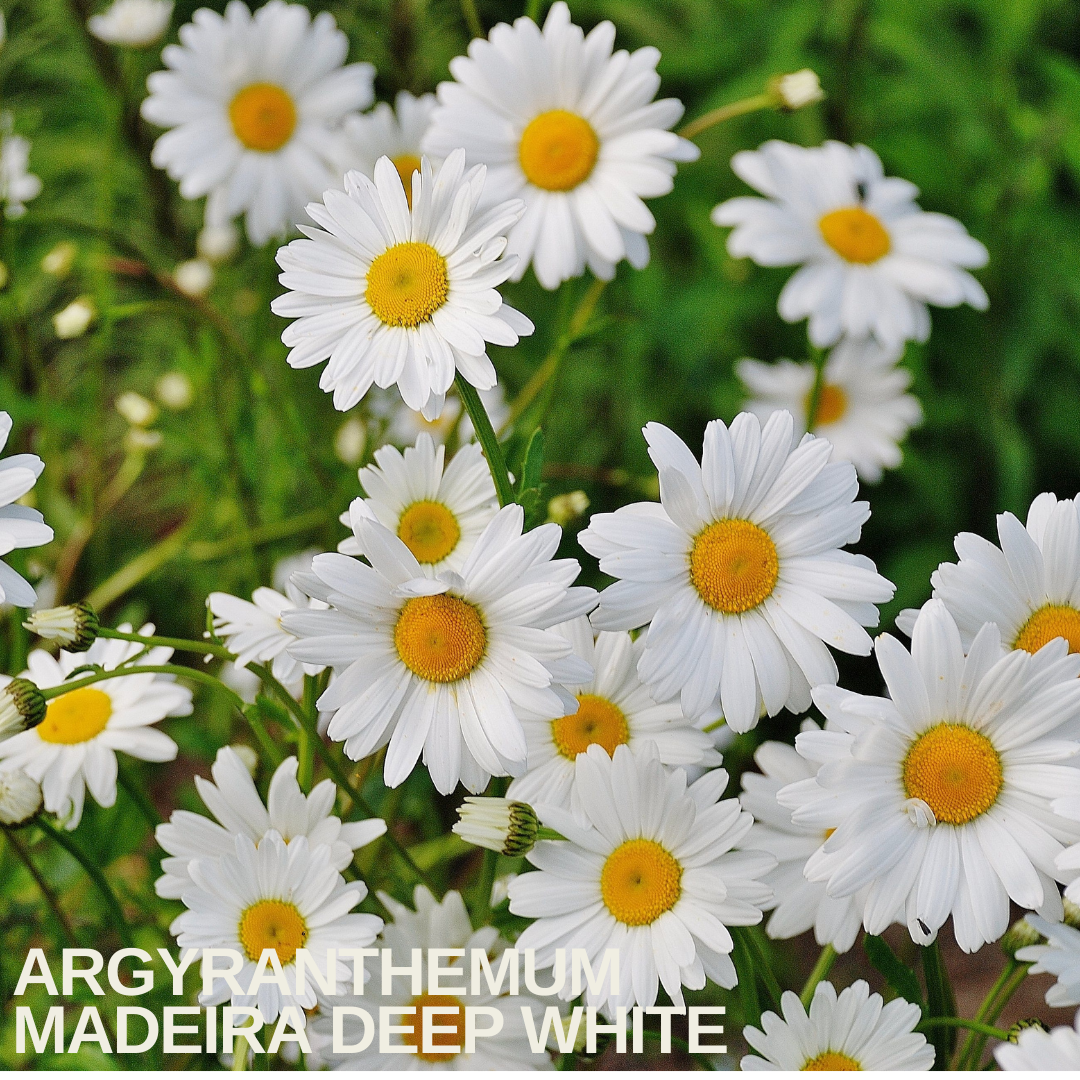 Argyranthemum Madeira White (Marguerite Daisy) is a vibrant, highly floriferous plant, popular for its classic daisy-like flowers. The blooms are arranged in multiple layers & distinguished by pure white petals & a golden-yellow centre, set against lush, dark green foliage. Loved by pollinators like bees & butterflies, these well-branched, upright plants grow up to 30cm tall—perfect for containers & colourful bedding displays.