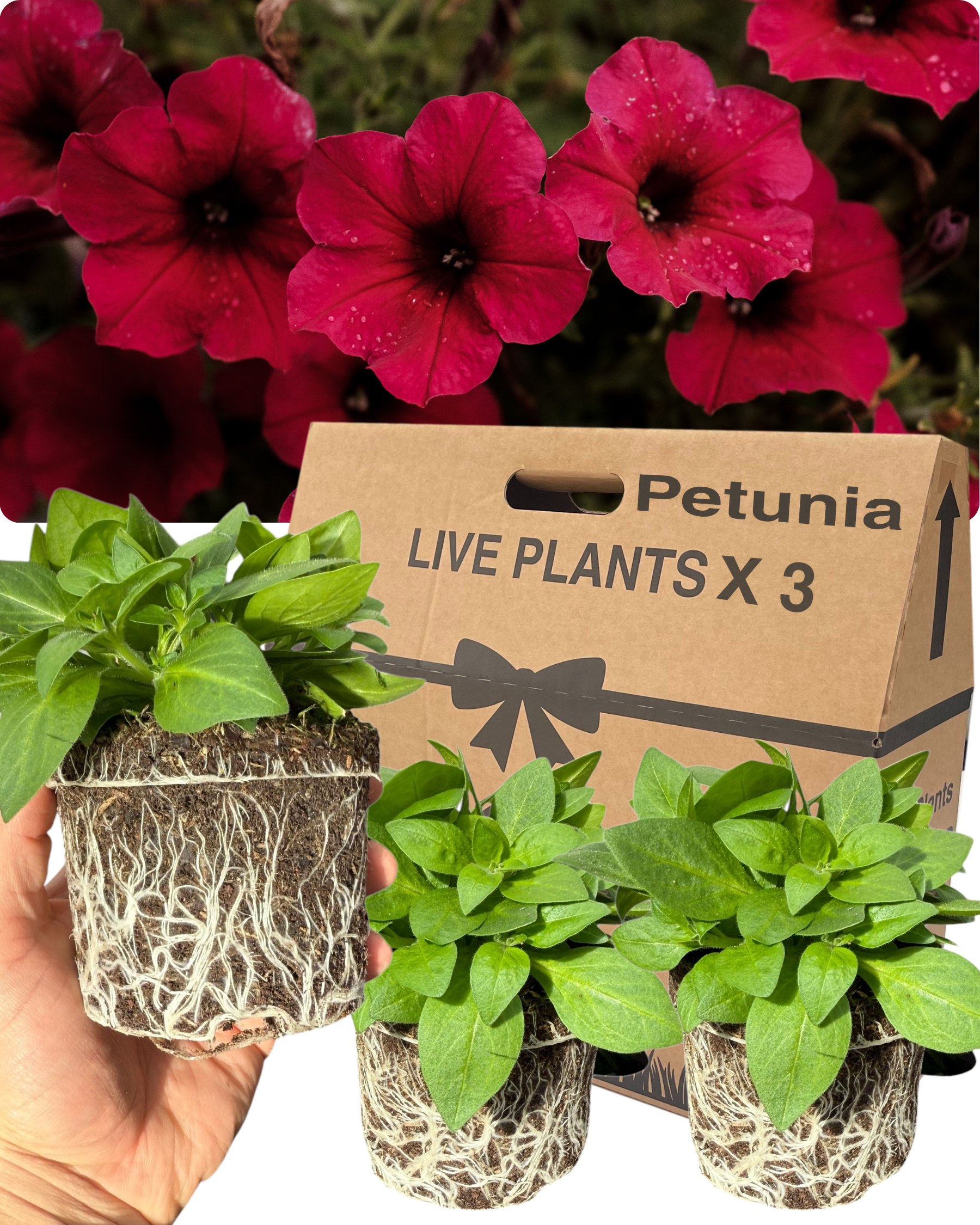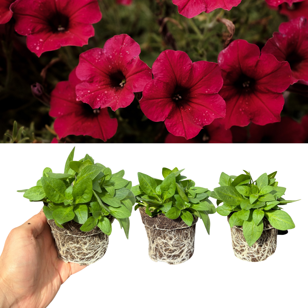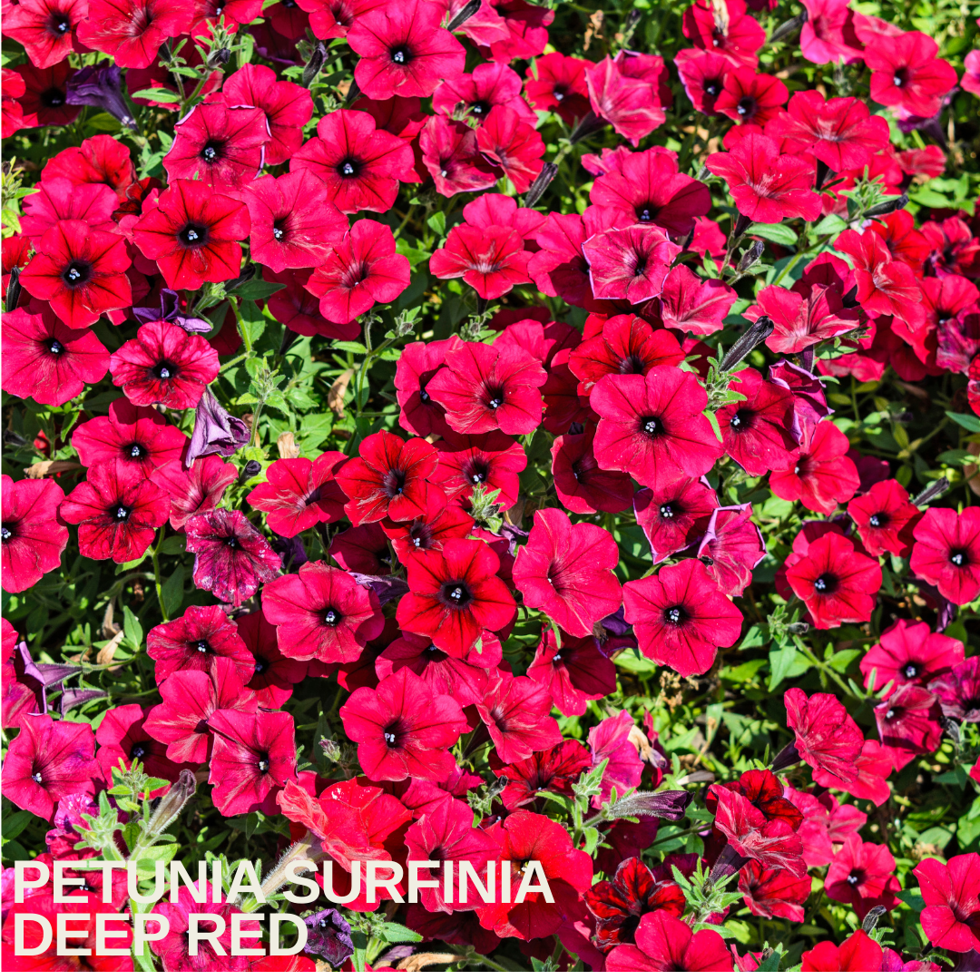 Petunia Surfinia Deep Red, an early-flowering variety, is popular for its intense, saturated & dramatic velvety red petals—one of the deepest true reds in the petunia family—set against a backdrop of medium green, softly textured foliage. A magnet for bees, butterflies & other pollinators, this petunia grows 20–30 cm tall & blooms continuously from early spring through to the first frost. It’s a high-performance hybrid, bred for lush, non-stop flowering.