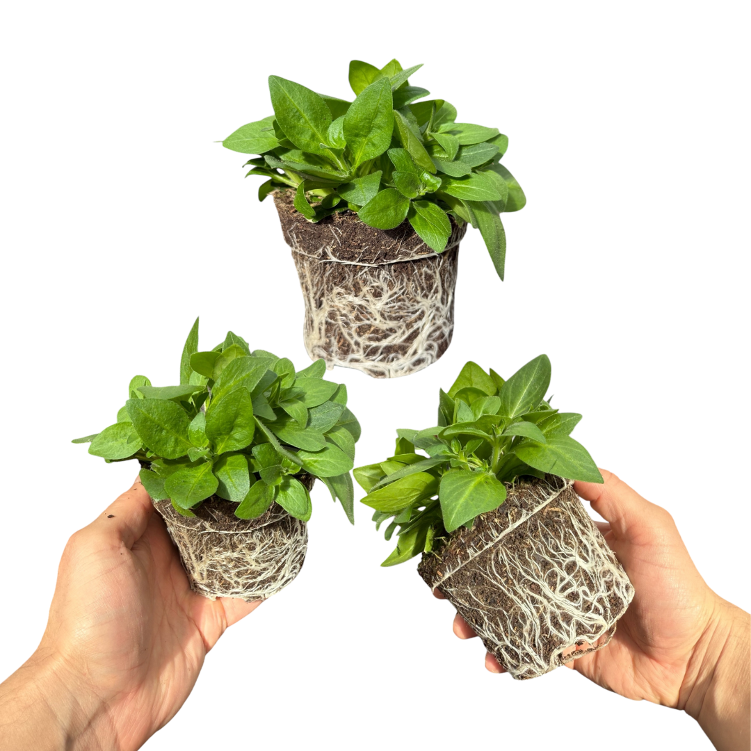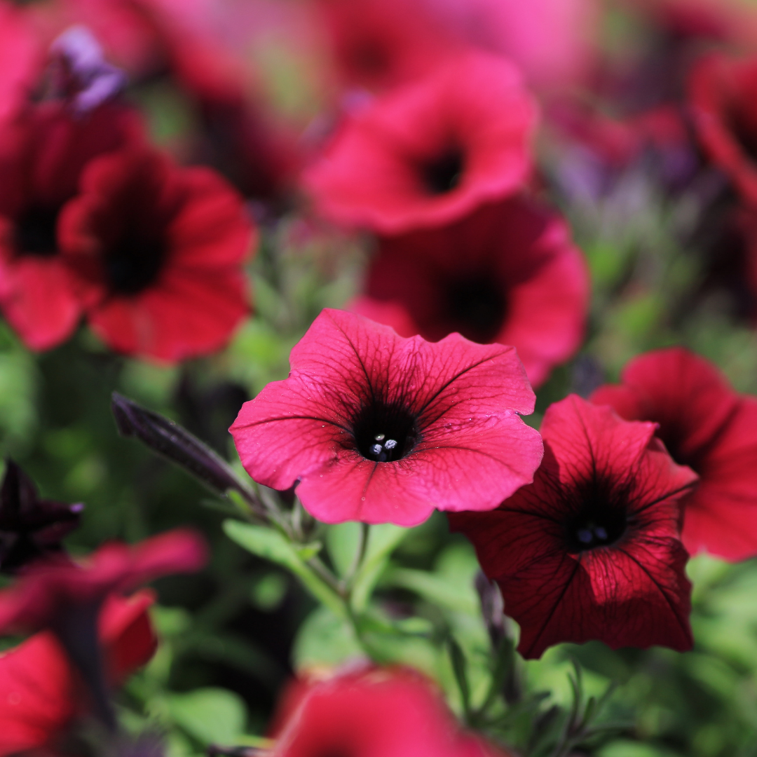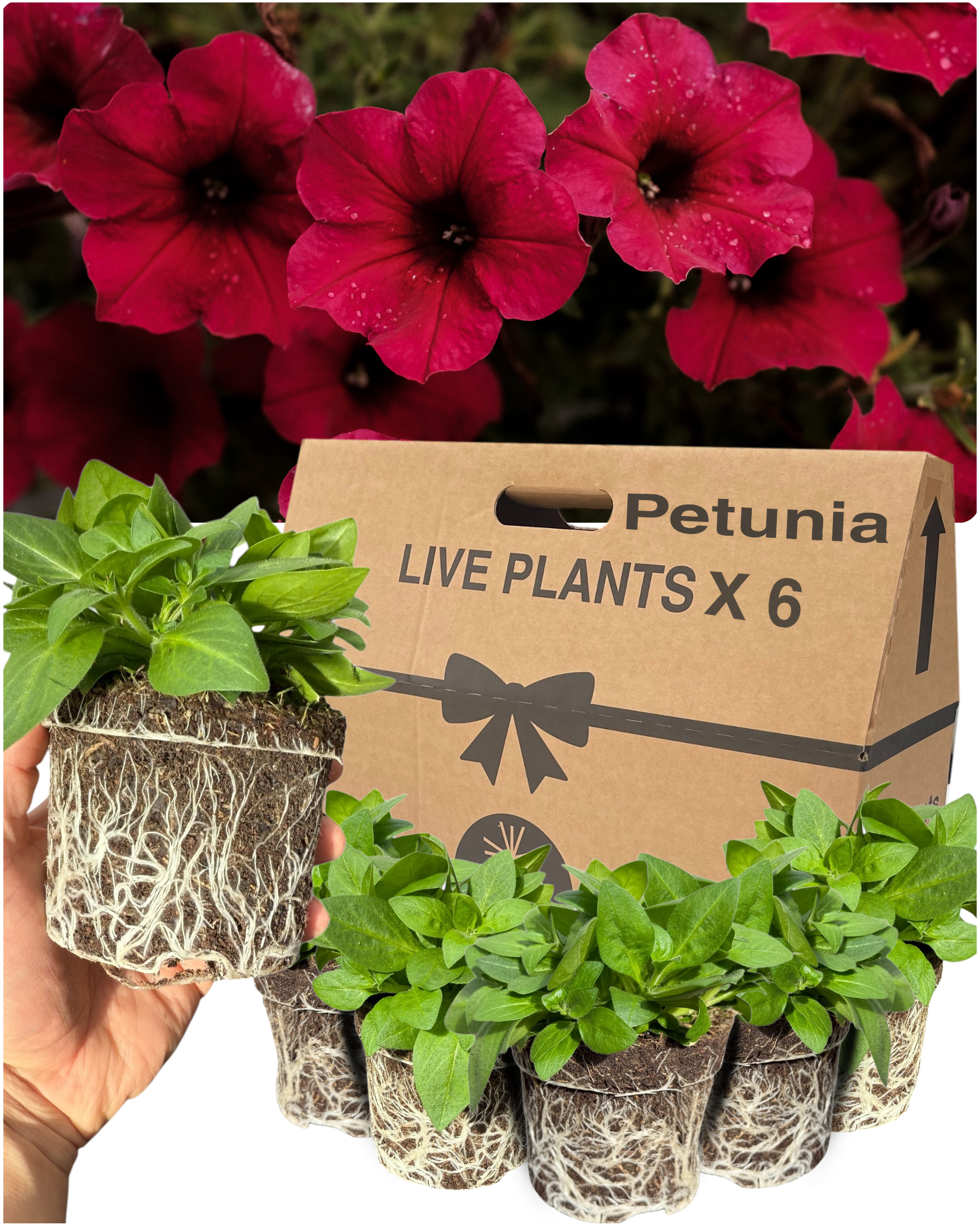 Petunia Surfinia Deep Red, an early-flowering variety, is popular for its intense, saturated & dramatic velvety red petals—one of the deepest true reds in the petunia family—set against a backdrop of medium green, softly textured foliage. A magnet for bees, butterflies & other pollinators, this petunia grows 20–30 cm tall & blooms continuously from early spring through to the first frost. It’s a high-performance hybrid, bred for lush, non-stop flowering.