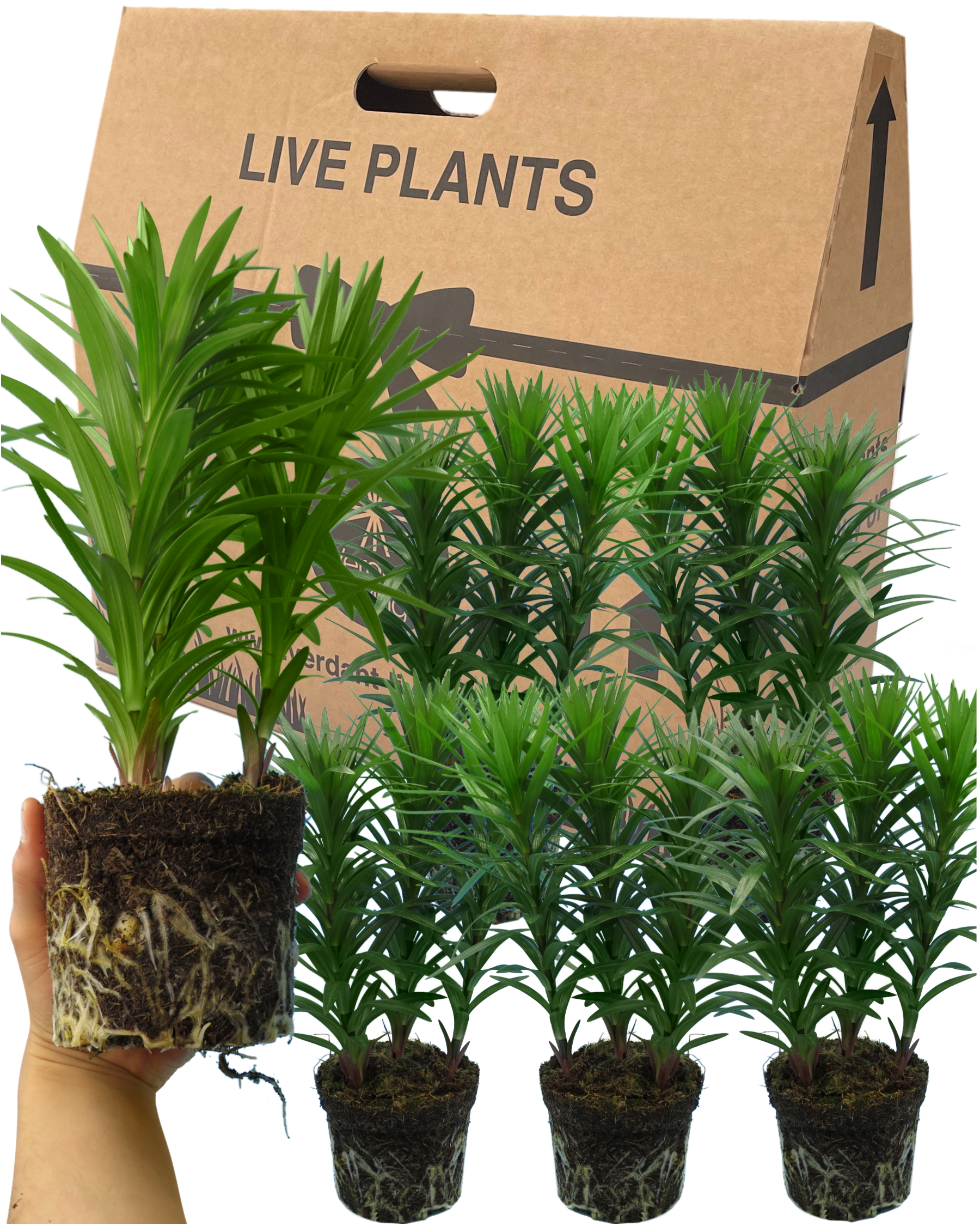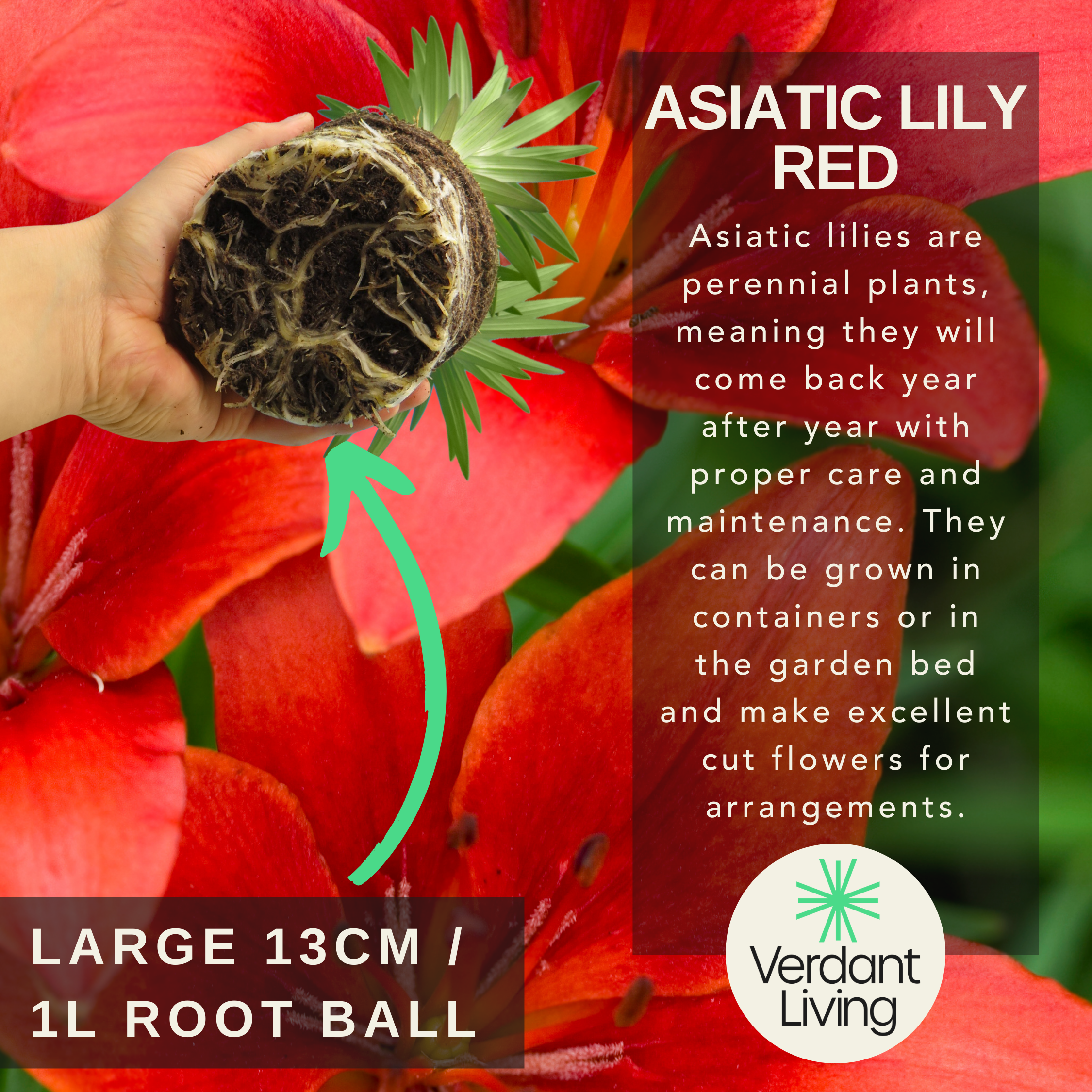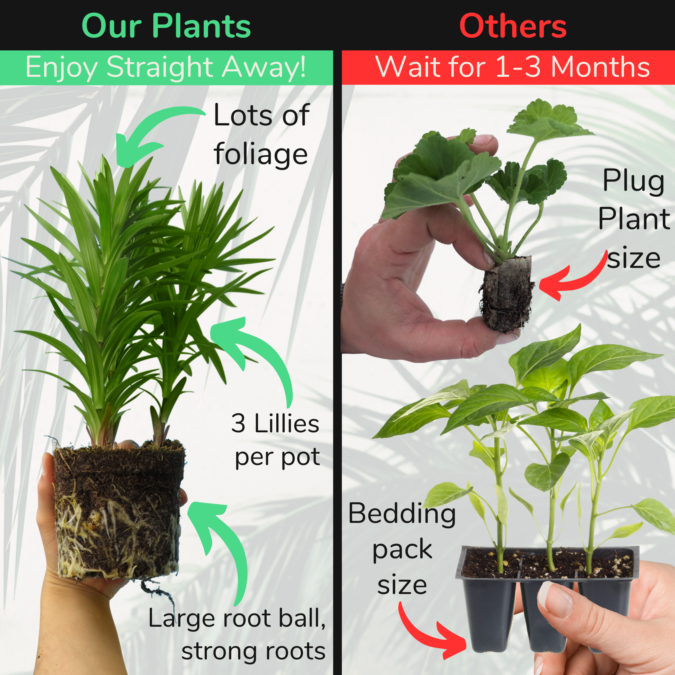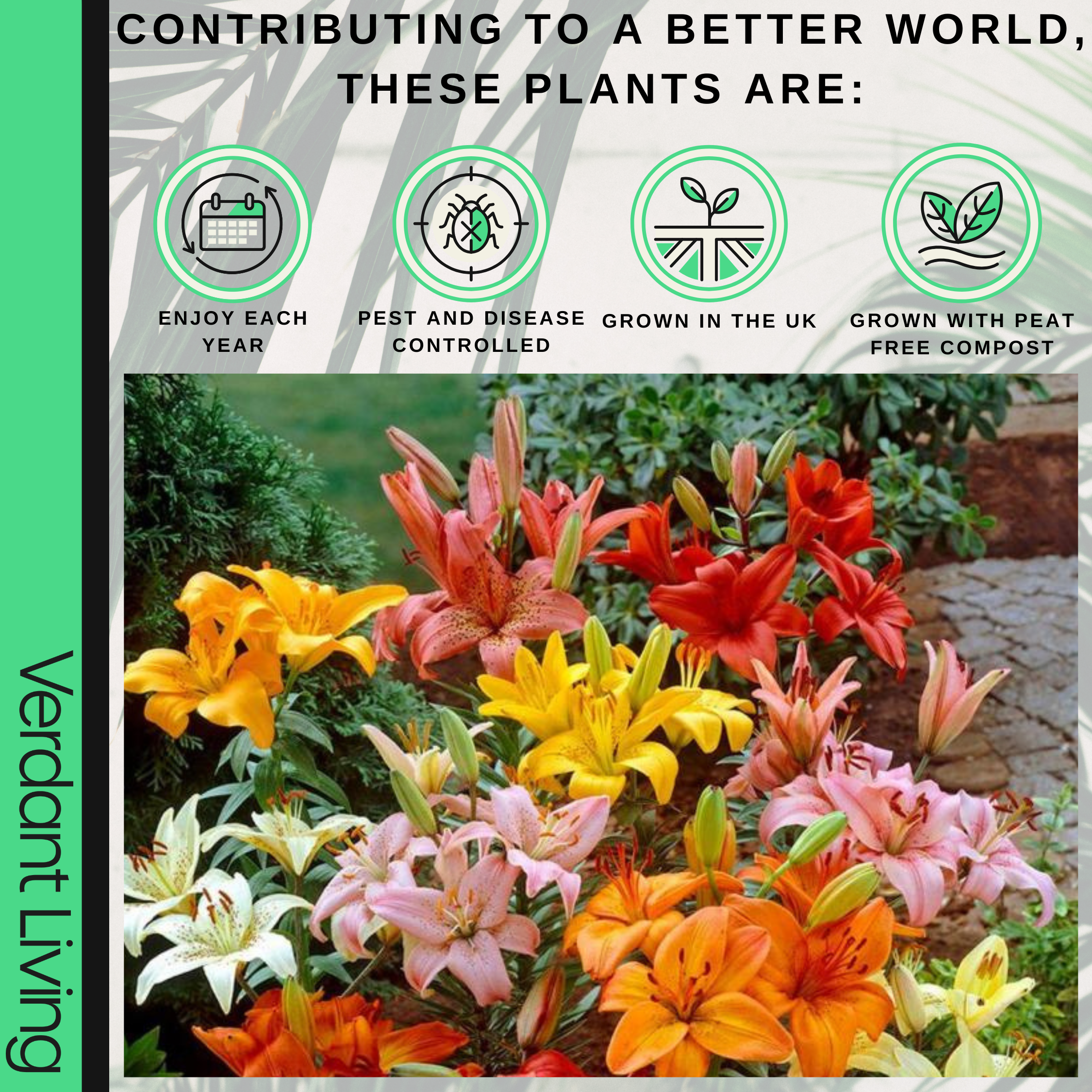 Create a fragrant paradise with our Asiatic Lily 'Garden Lily' collection. Each pot contains three vibrant lilies, lovingly grown in Yorkshire in a 13cm, 1 litre pot, ensuring robust growth and stunning blooms. These lilies boast trumpet-shaped flowers renowned for their fragrance and vivid hues, making them a delightful addition to any garden or floral arrangement. Elevate your garden with the timeless elegance of potted lilies. Add a pop of colour, fragrance, and charm to your outdoor space with our exquisite collection.