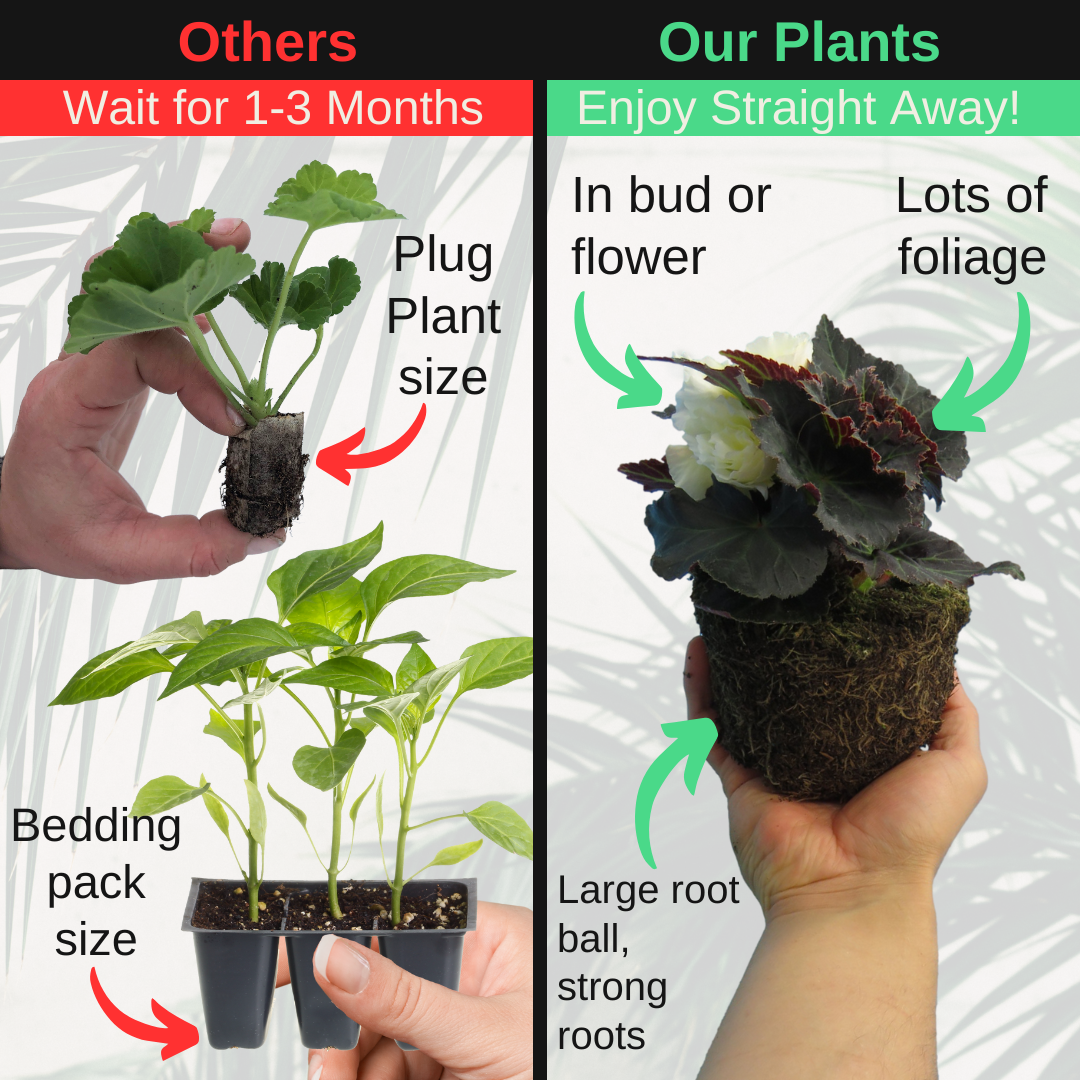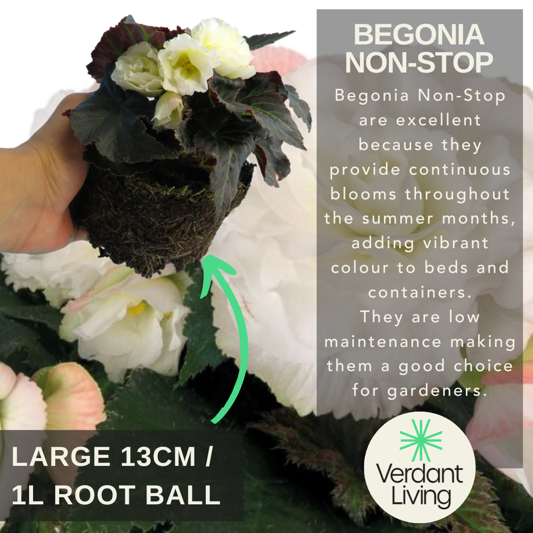 Our Large Begonia Nonstop Bedding Plants are a game-changer for any garden enthusiast. With a full grown height of 38cm and a spread of 45cm, these plants are substantial enough to make a colourful statement. Perfect for creating stunning displays in containers, hanging baskets, or garden beds, these begonias ensure your garden is bursting with vibrant colour all summer long.