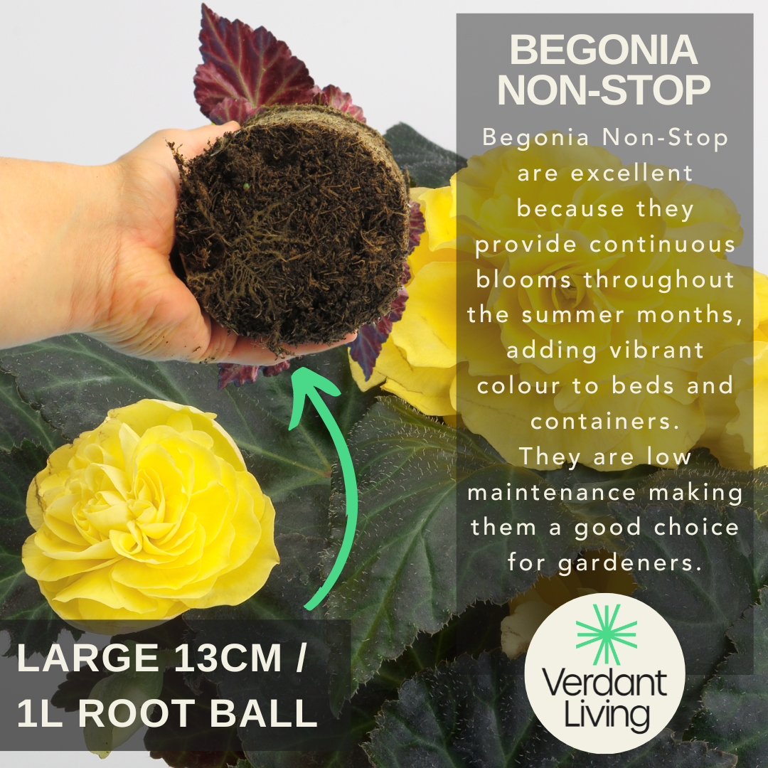 Our Large Begonia Nonstop Bedding Plants are a game-changer for any garden enthusiast. With a full grown height of 38cm and a spread of 45cm, these plants are substantial enough to make a colourful statement. Perfect for creating stunning displays in containers, hanging baskets, or garden beds, these begonias ensure your garden is bursting with vibrant colour all summer long.