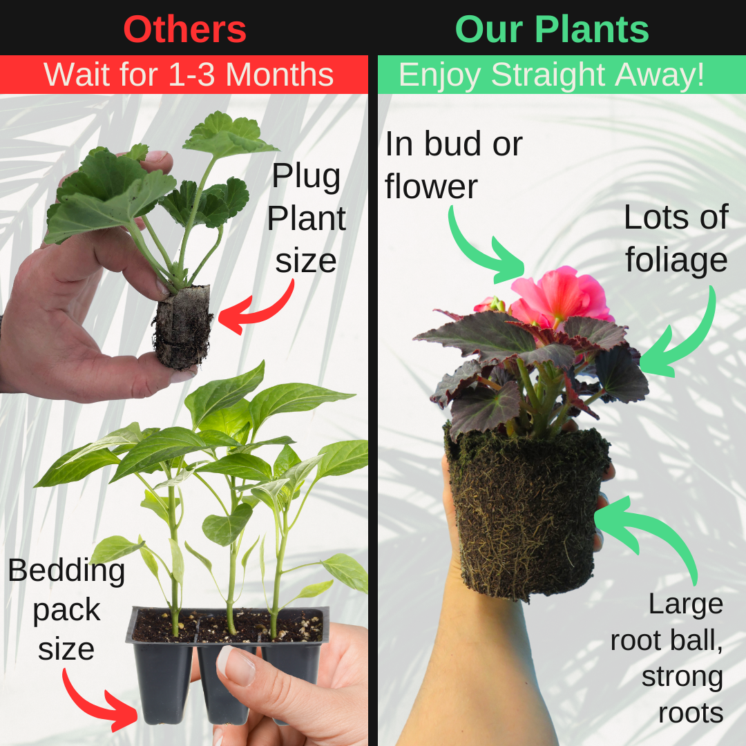 Our Large Begonia Nonstop Bedding Plants are a game-changer for any garden enthusiast. With a full grown height of 38cm and a spread of 45cm, these plants are substantial enough to make a colourful statement. Perfect for creating stunning displays in containers, hanging baskets, or garden beds, these begonias ensure your garden is bursting with vibrant colour all summer long.