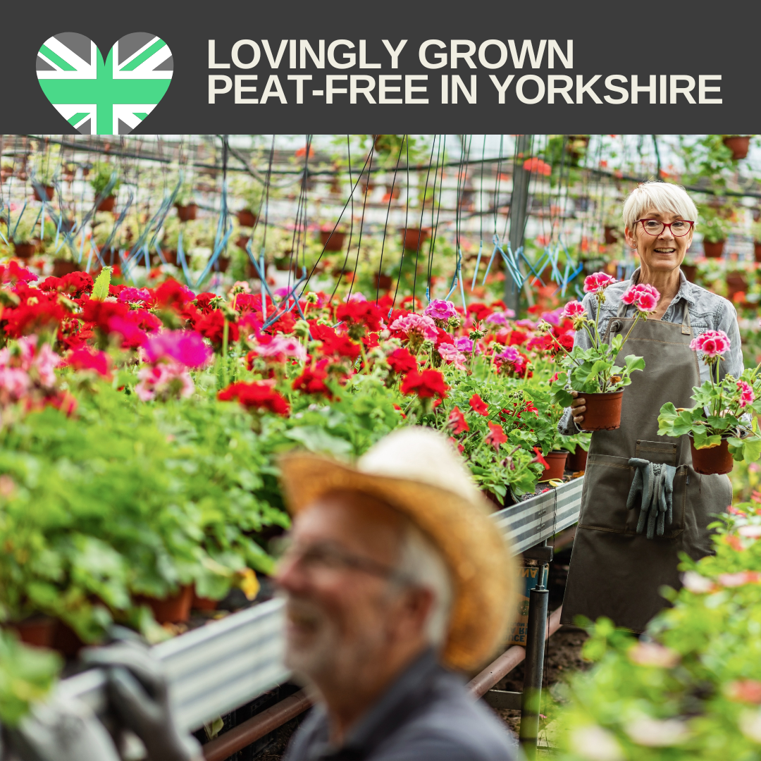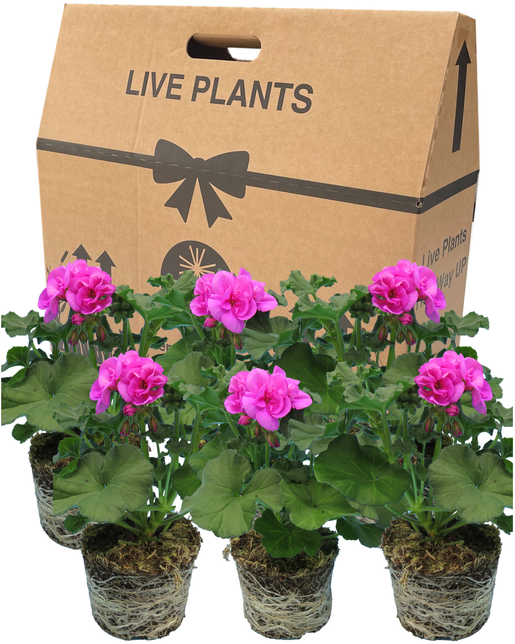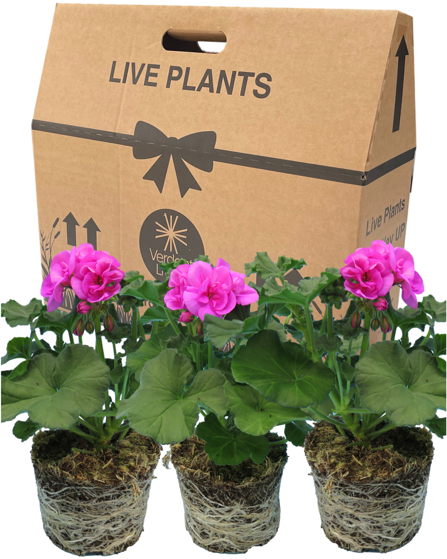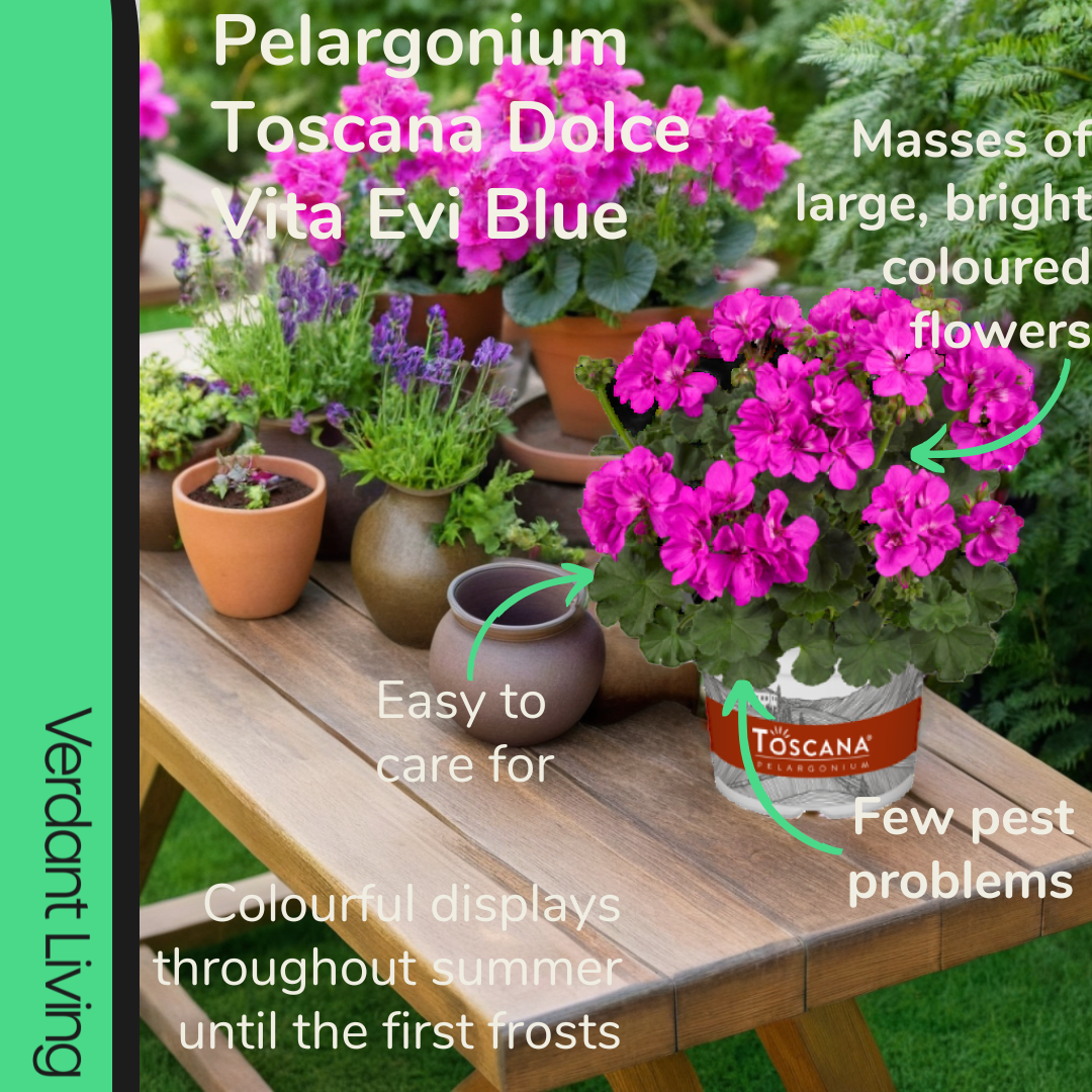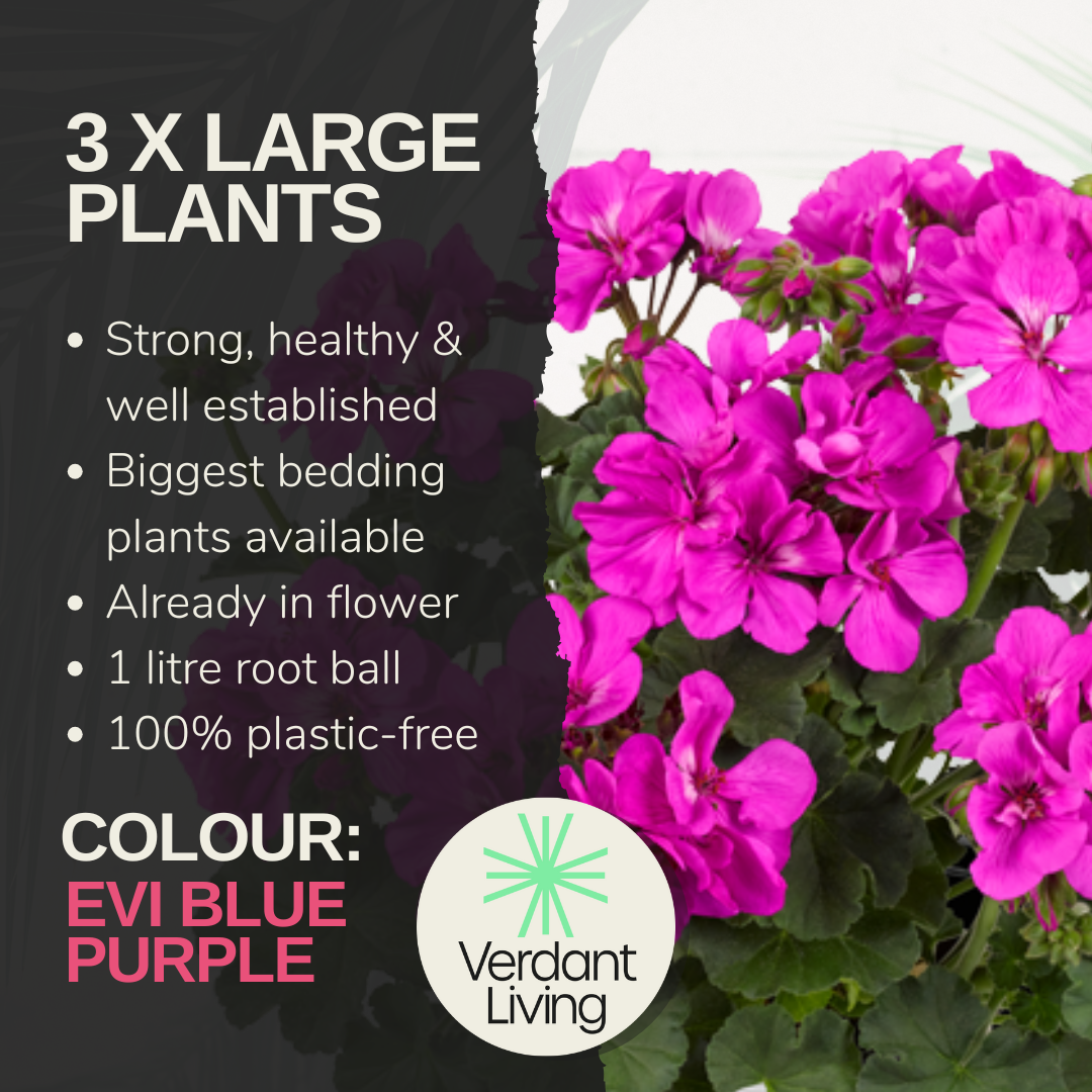 Geraniums (Pelargonium) are attractive and popular flowering annuals, generating lots of very large, interesting flowers, set against large dark green leaves. Perfect for container filling or a centre piece in baskets or window boxes. Stunning plants, with healthy roots, a gardener's dream. Arriving safely packed in a giftable box, from our British Nursery, creating an outdoors gardening experience to enjoy. Dolce Vita Evi Blue, mauve/purple flowers all summer.