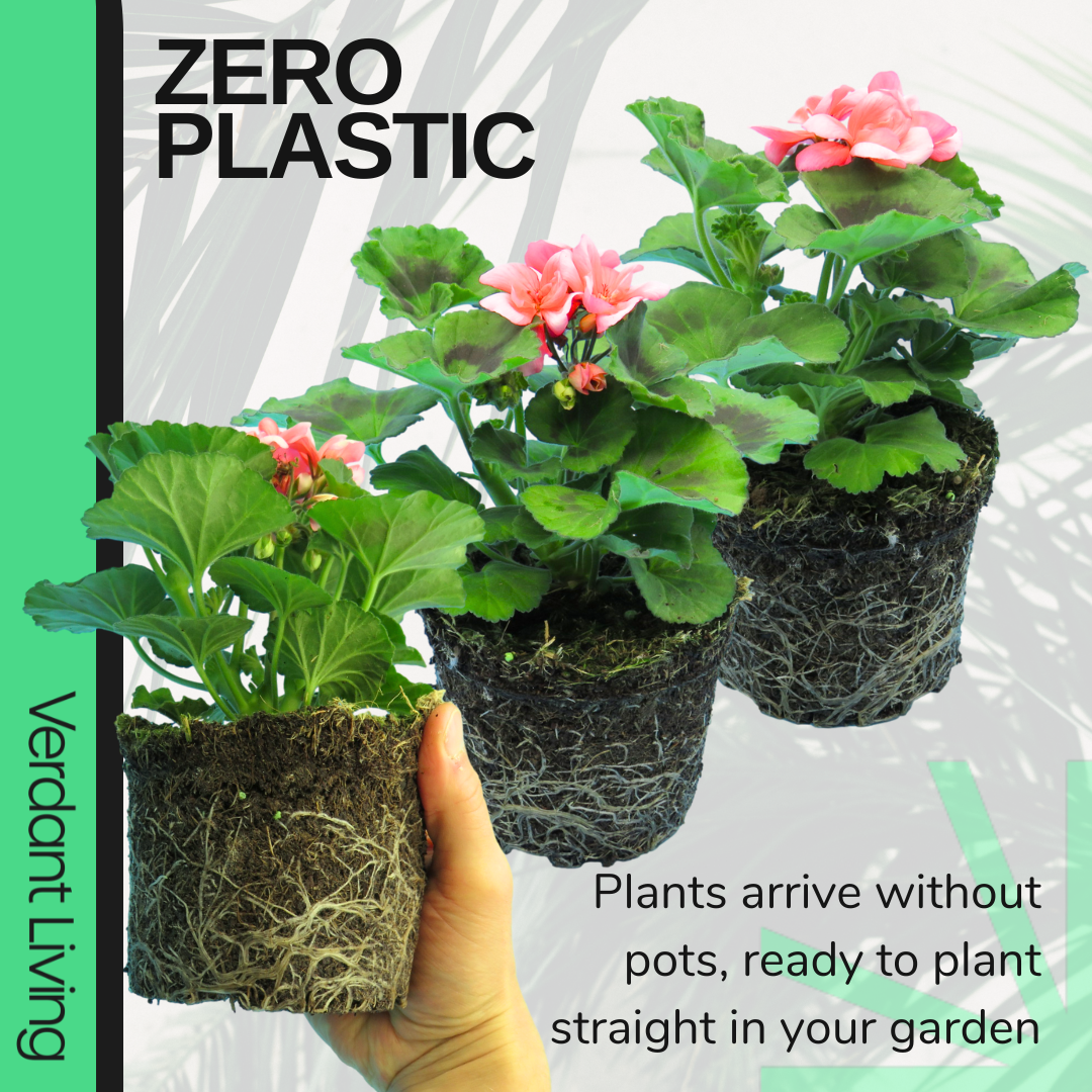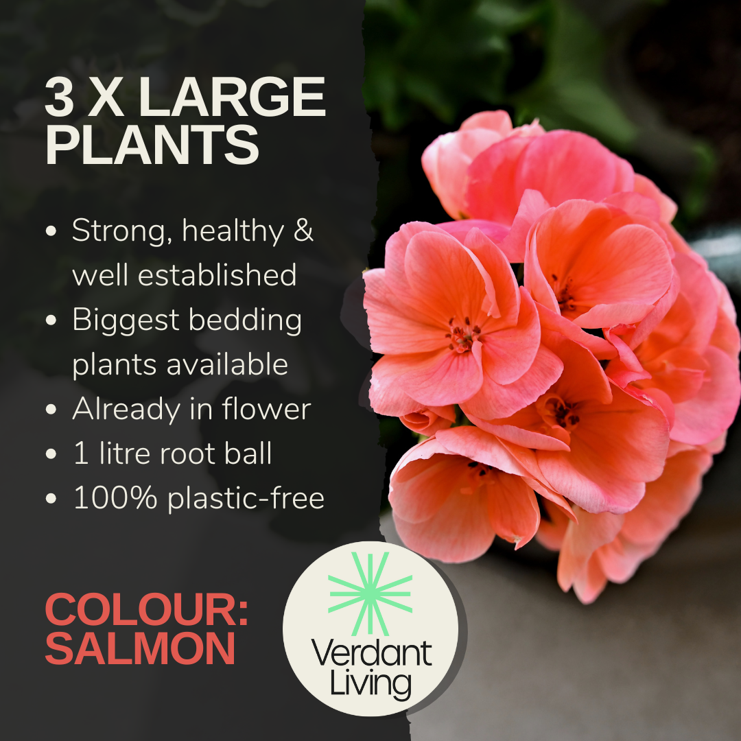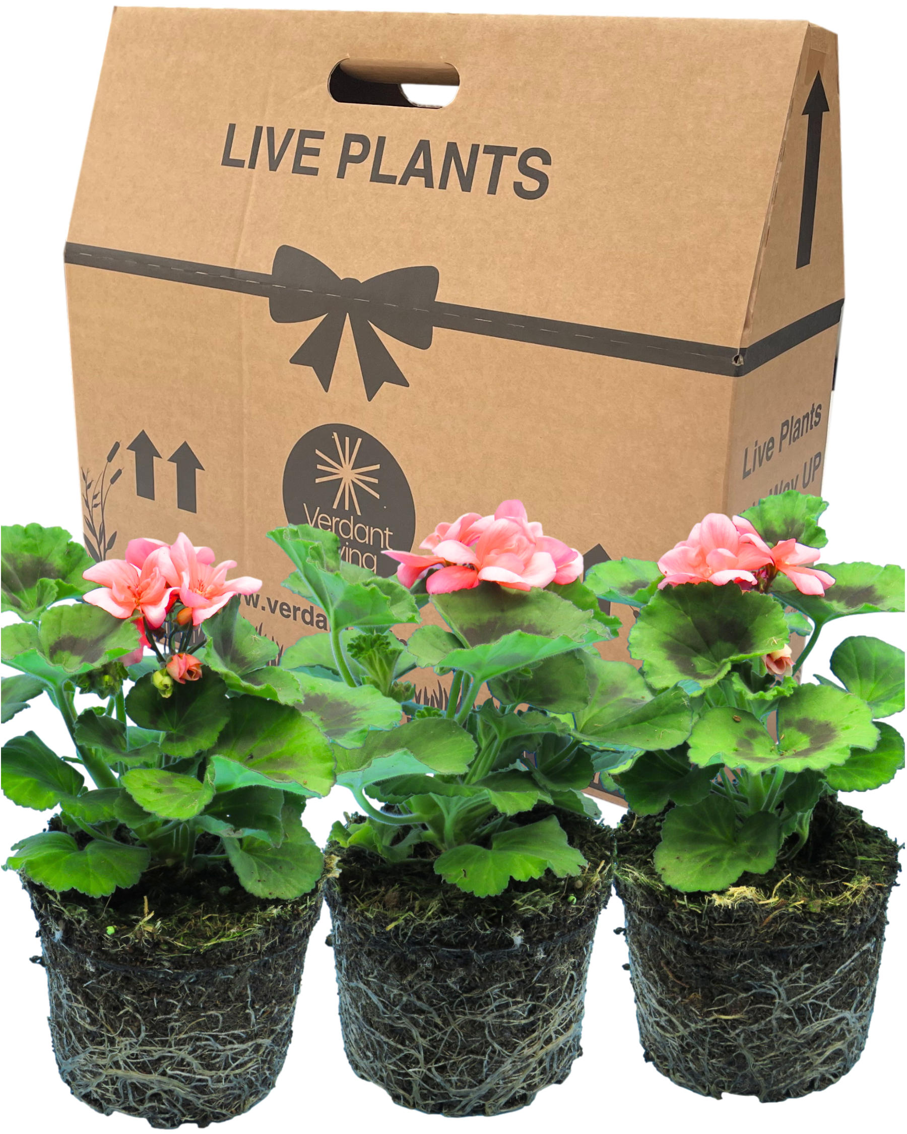 Geraniums (Pelargonium) are attractive and popular flowering annuals, generating lots of very large, interesting flowers, set against large dark green leaves. Perfect for container filling or a centre piece in baskets or window boxes. Stunning plants, with healthy roots, a gardener's dream. Arriving safely packed in a giftable box, from our British Nursery, creating an outdoors gardening experience to enjoy. Salmon Pink non-stop flowers all summer.