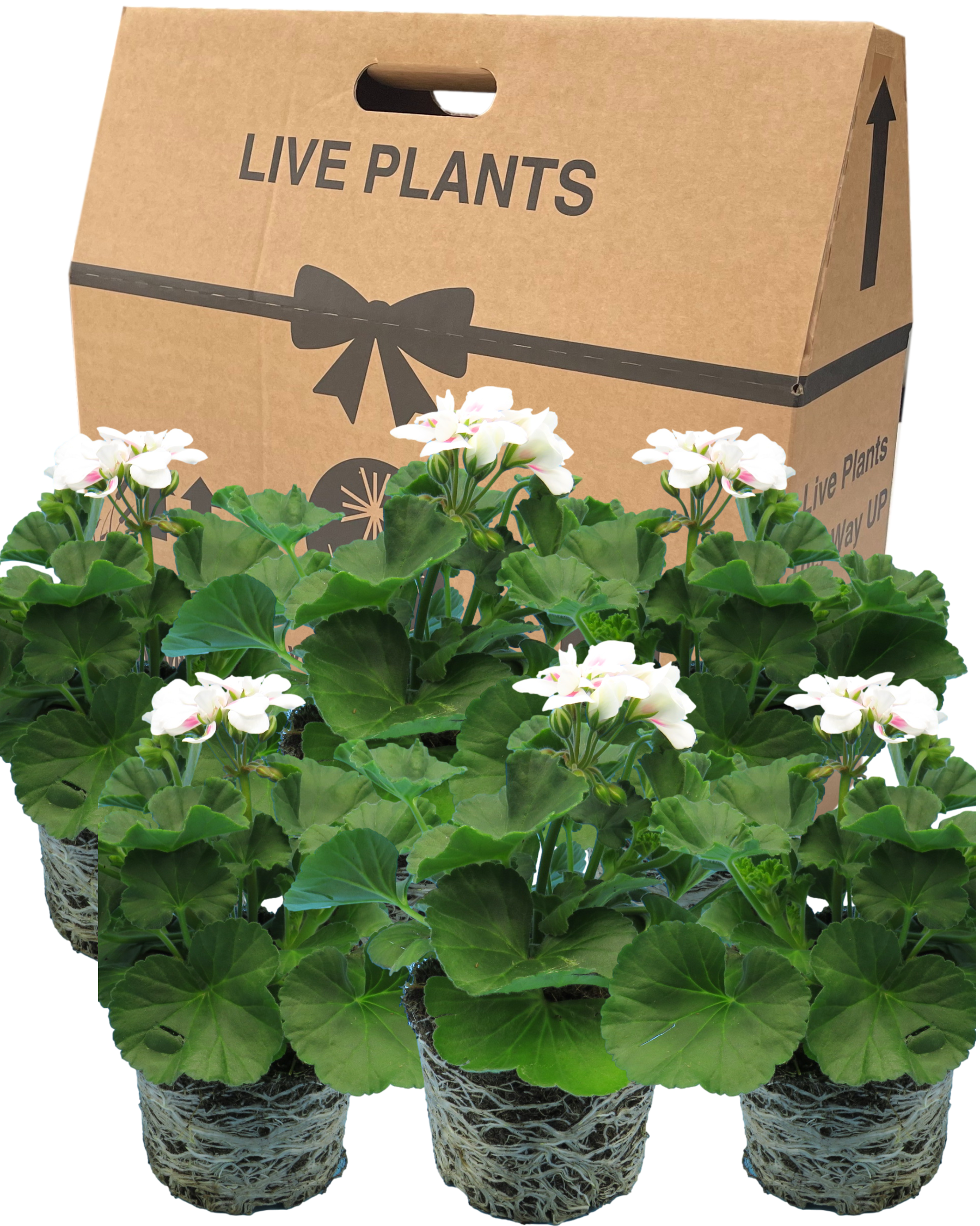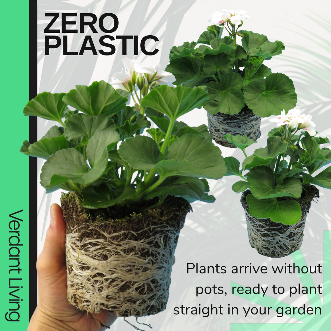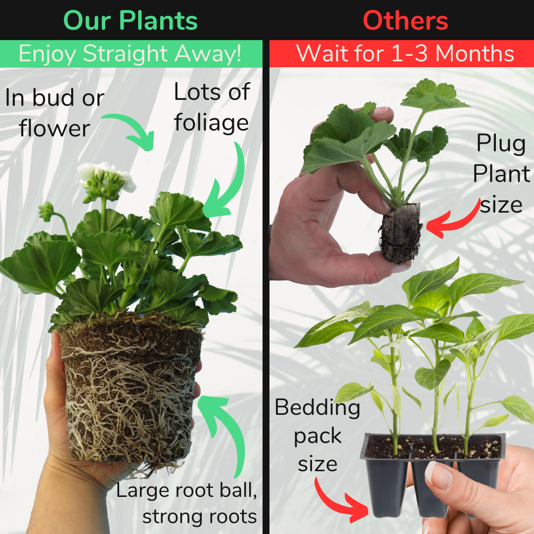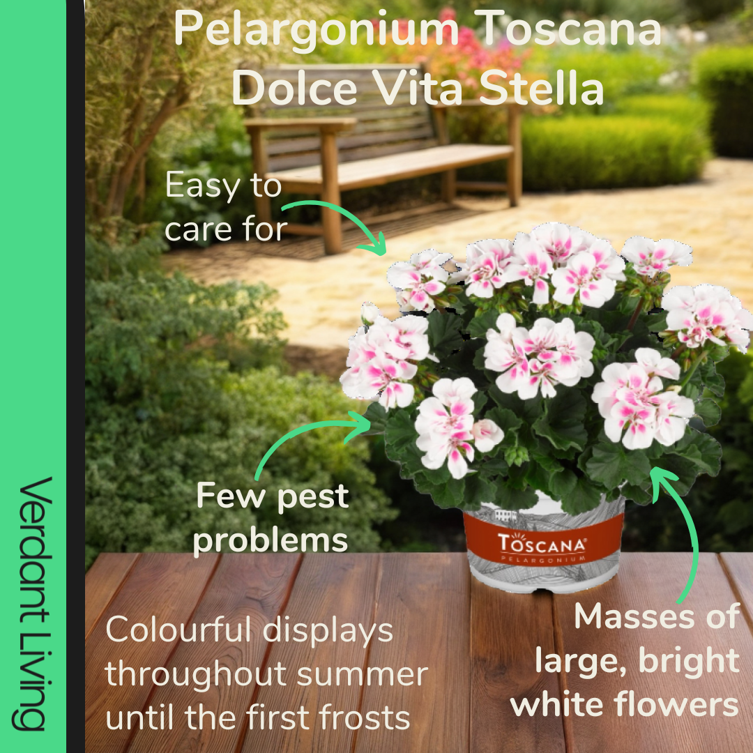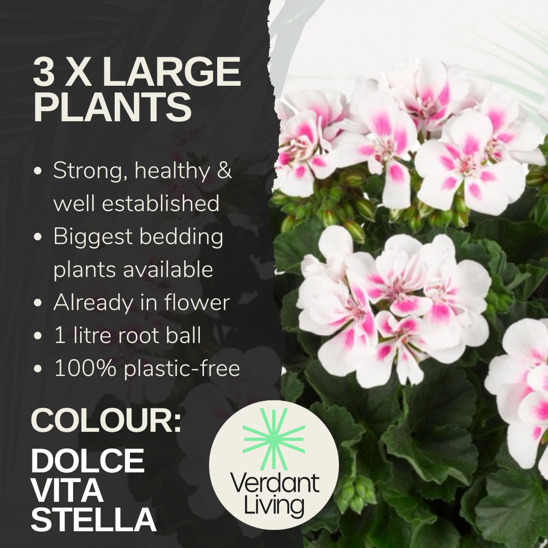 Geraniums (Pelargonium) are attractive and popular flowering annuals, generating lots of very large, interesting flowers, set against large dark green leaves. Perfect for container filling or a centre piece in baskets or window boxes. Stunning plants, with healthy roots, a gardener's dream. Arriving safely packed in a giftable box, from our British Nursery, creating an outdoors gardening experience to enjoy. Dolce Vita Evi Stella, white/pink flowers all summer.