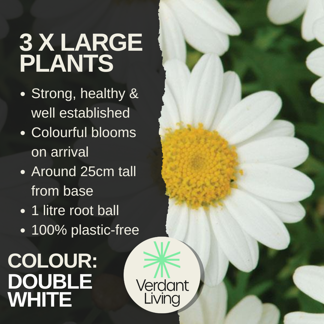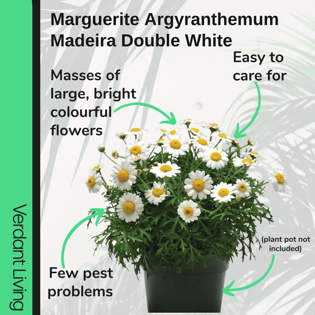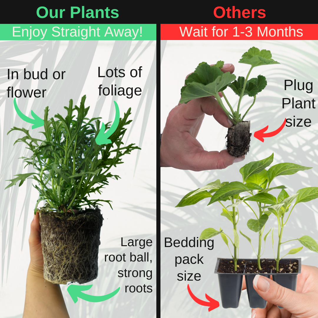 Large garden plants live for planting now. Not seeds, not bulbs, not corms, not a plug and not bare root. These bedding plants are real live potted garden centre size full 1ltr rootball (13cm diameter pot grown) summer flowering annuals. Ideal for balcony, planting tubs, pots, hanging baskets or growing fast in a border. These Madeira ‘Double White’ are healthy and fresh plants, offering great value this gardening season.