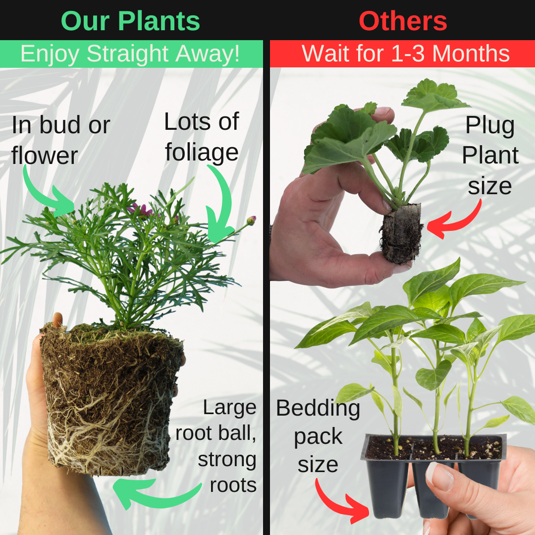Mixed Colour, Large garden plants live for planting now. Not seeds, not bulbs, not corms, not a plug and not bare root. These bedding plants are real live potted garden centre size full 1ltr rootball (13cm diameter pot grown) summer flowering annuals. Ideal for balcony, planting tubs, pots, hanging baskets or growing fast in a border. These Madeira ‘Pink, White & Yellow’ are healthy and fresh plants, offering great value this gardening season.