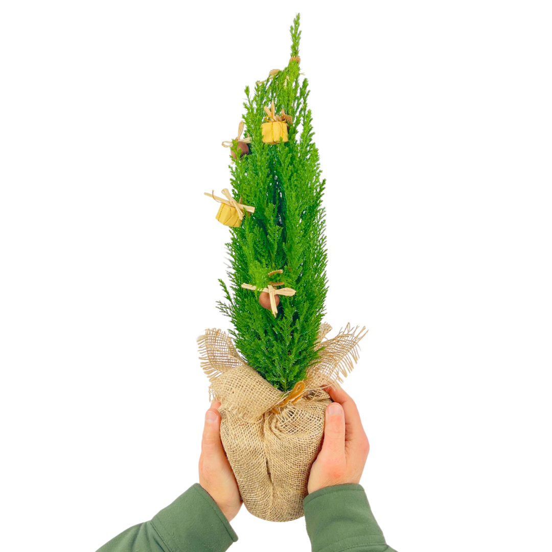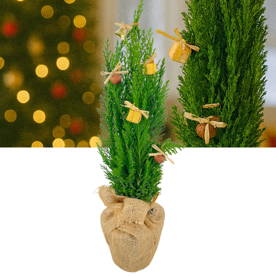 You can choose from a range of beautifully styled options, including rustic jute-wrapped trees, modern white metal planters, traditional red metal planters, and cosy lighted spruce trees with LED illumination. The collection features premium living trees such as Cypress Ellwoodii, Stone Pine, Dwarf Alberta Spruce, and December Spruce, offering variations in colour, needle texture & fragrance.