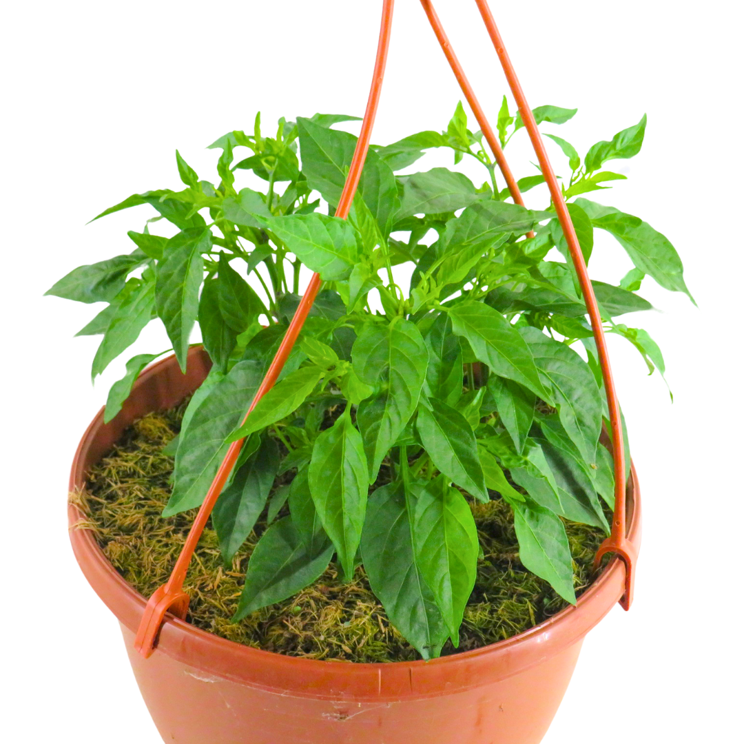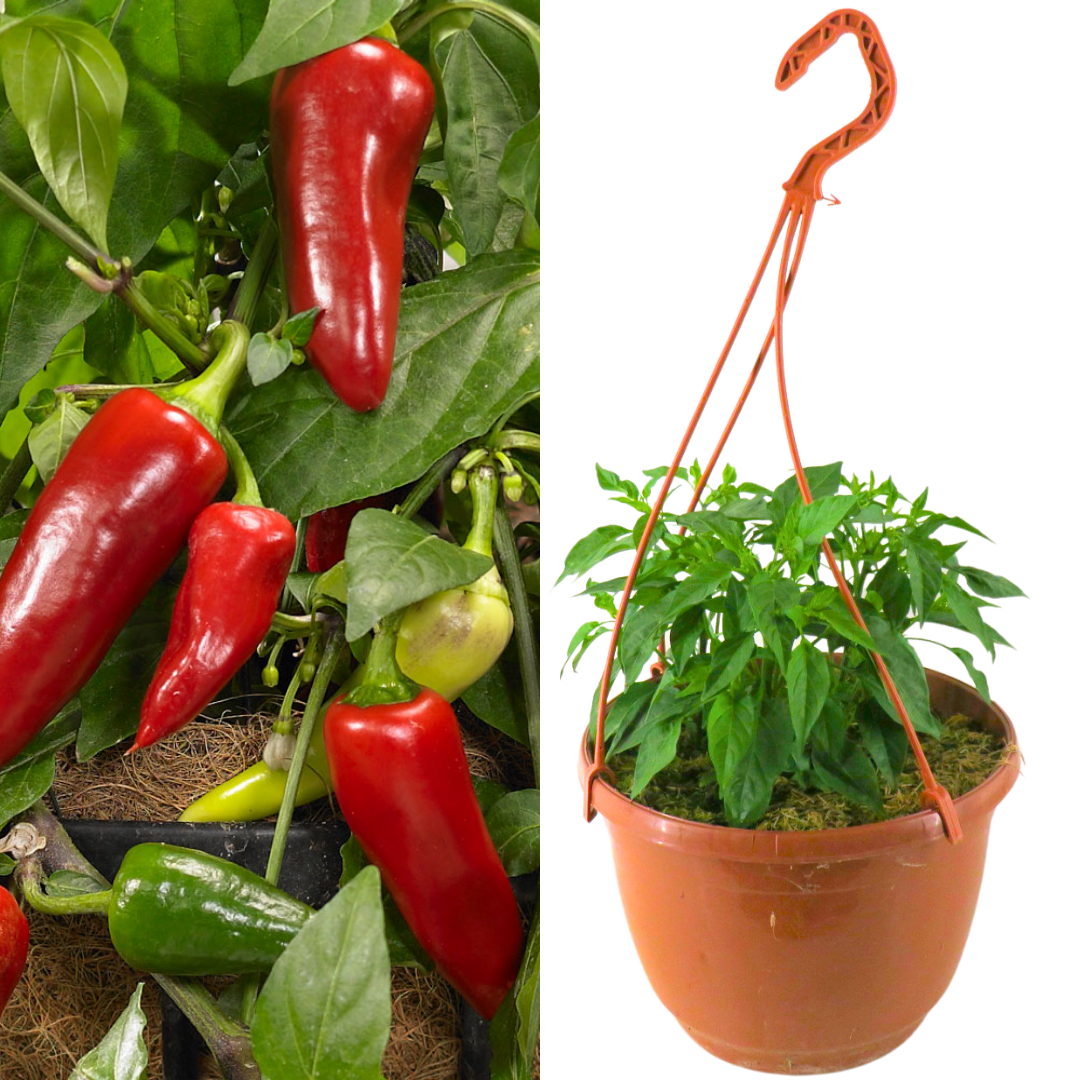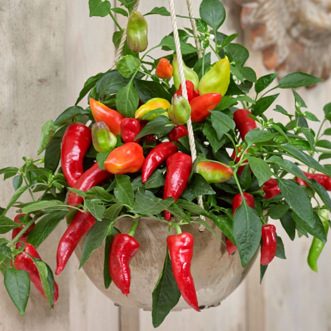 Pre-planted in a 25 cm hanging basket and already rooted in peat-free compost, each plant is ready to go straight onto a sunny bracket, balcony rail or greenhouse rafter. Choose from mild or medium heat: ‘Spicy Jane Red’ delivers glossy scarlet fruit with a sweet-jalapeño kick, while ‘Peppers from Heaven’ offers crisp, crunchy pods that stay mellow even when fully ripe. Compact and neatly mounded at first, each plant trails beautifully as the fruit sets—doubling as a living edible display.