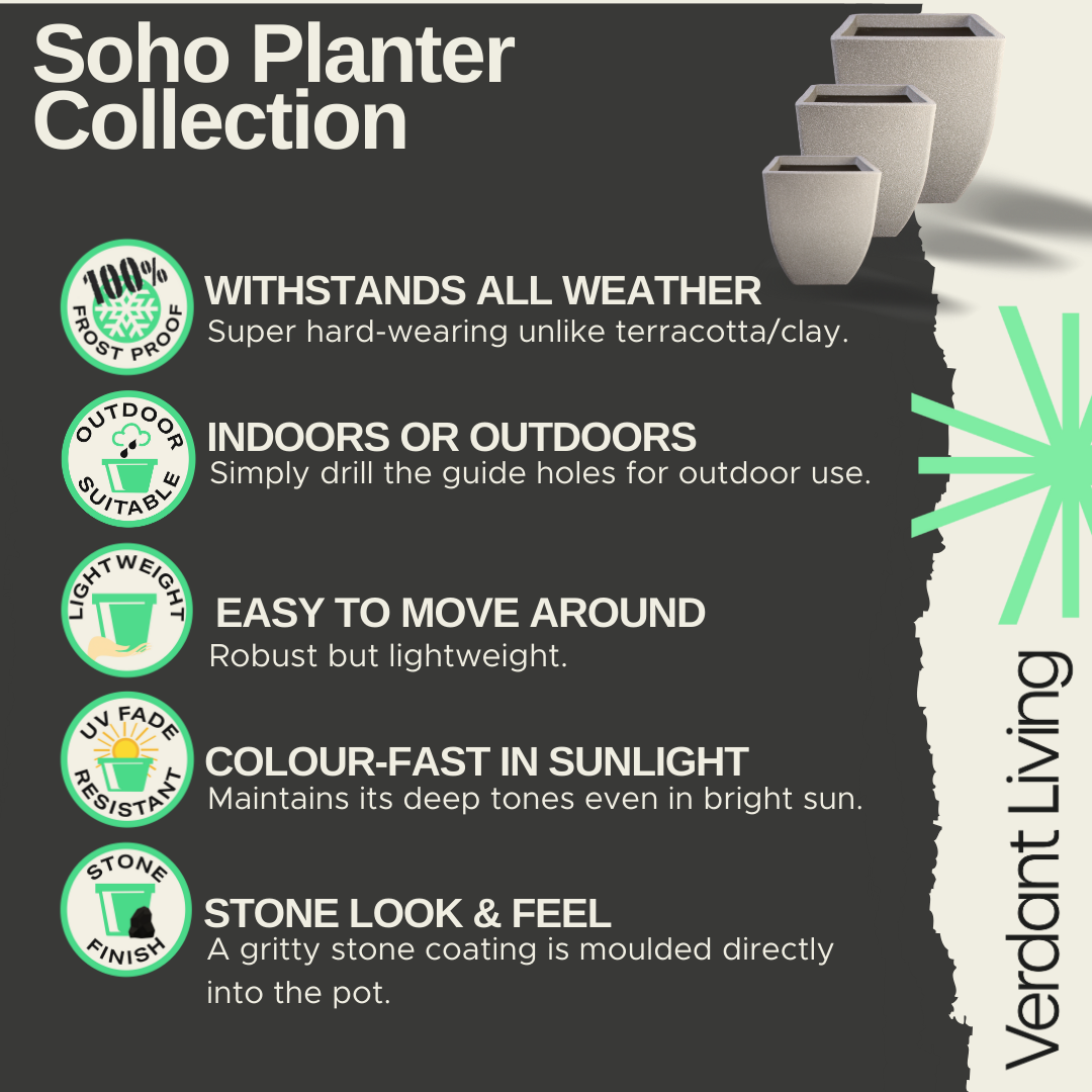 Bring modern, urban style to your outdoor space with the Soho Square Garden Planter. Designed with clean lines and a contemporary stone-effect finish, this planter delivers the look of natural stone with the durability and lightweight practicality of high-quality plastic.